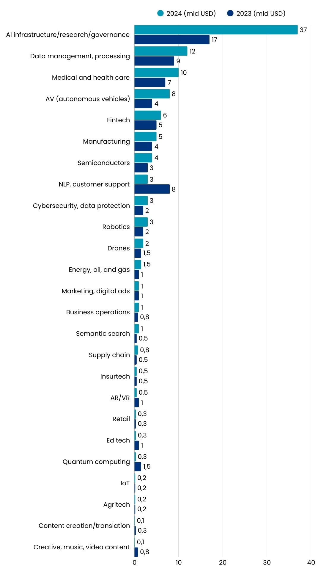 However, most private investment in AI worldwide does not focus on specific applications of this technology in particular industries, such as medicine, education or the military. The vast majority of these funds are invested in the infrastructure needed to train advanced artificial intelligence models (in particular, generative AI), followed by data processing. The aim is to continuously increase the amount of training data and computing power.
