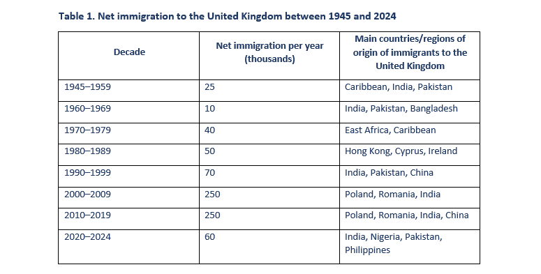 After 1948, the Labour government, responding to post-war labour shortages, created a single legal definition of “citizenship of the UK and Colonies”, which included both Britons and colonial British subjects, and entrenched the right of the latter to enter the UK. This led to mass immigration, in particular from the West Indies (aggregate data on immigration waves between 1945 and 2025 is presented in Table 1 and Chart 1). Although since 1971 citizens of former British colonies have lost their automatic right of entry and permanent residence, the UK’s accession to the European Community in 1973 opened up a n