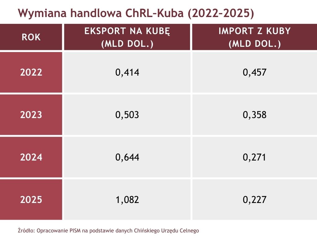 Kondycja ekonomiczna Kuby pogorszyła się po zatrzymaniu w styczniu br. przez USA Nicolása Maduro, zwiększeniu kontroli Stanów Zjednoczonych nad polityką Wenezueli, a co za tym idzie – wstrzymaniu dostaw ropy naftowej na Kubę. Na skutek przywrócenia sankcji amerykańskich w styczniu 2025 r. sytuacja gospodarcza wyspy się pogarszała. Była ona zależna m.in. od dostaw surowców nie tylko z Wenezueli, ale również Rosji i Meksyku. Administracji Donalda Trumpa udało się je albo zatrzymać, albo znacząco zmniejszyć. Kuba była od wielu lat partnerem ChRL o znaczeniu politycznym, symbolicznym w kontekście rywalizacji chińsko-amerykańskiej. W obliczu wyzwań dla gospodarki wyspy jeszcze pod koniec stycznia br. Chiny przekazały ponad 60 tys. ton ryżu. Ostatnio zadeklarowały także dostawę urządzeń fotowoltaicznych, ułatwiających produkcję prądu elektrycznego na wyspie. Rzecznik MSZ ChRL, podobnie jak w przypadku Wenezueli, wyraża niezgodę Chin na ingerencję USA w sprawy Kuby. Wsparcie dla niej pozostanie jednak ograniczone do gestów politycznych i pomocy humanitarnej. Władze chińskie nie chcą, aby ewentualna eskalacja sporu zaszkodziła ich ważniejszym celom dotyczącym Tajwanu, realizowanym w ramach przygotowań do wizyty prezydenta Trumpa w Chinach w kwietniu br.