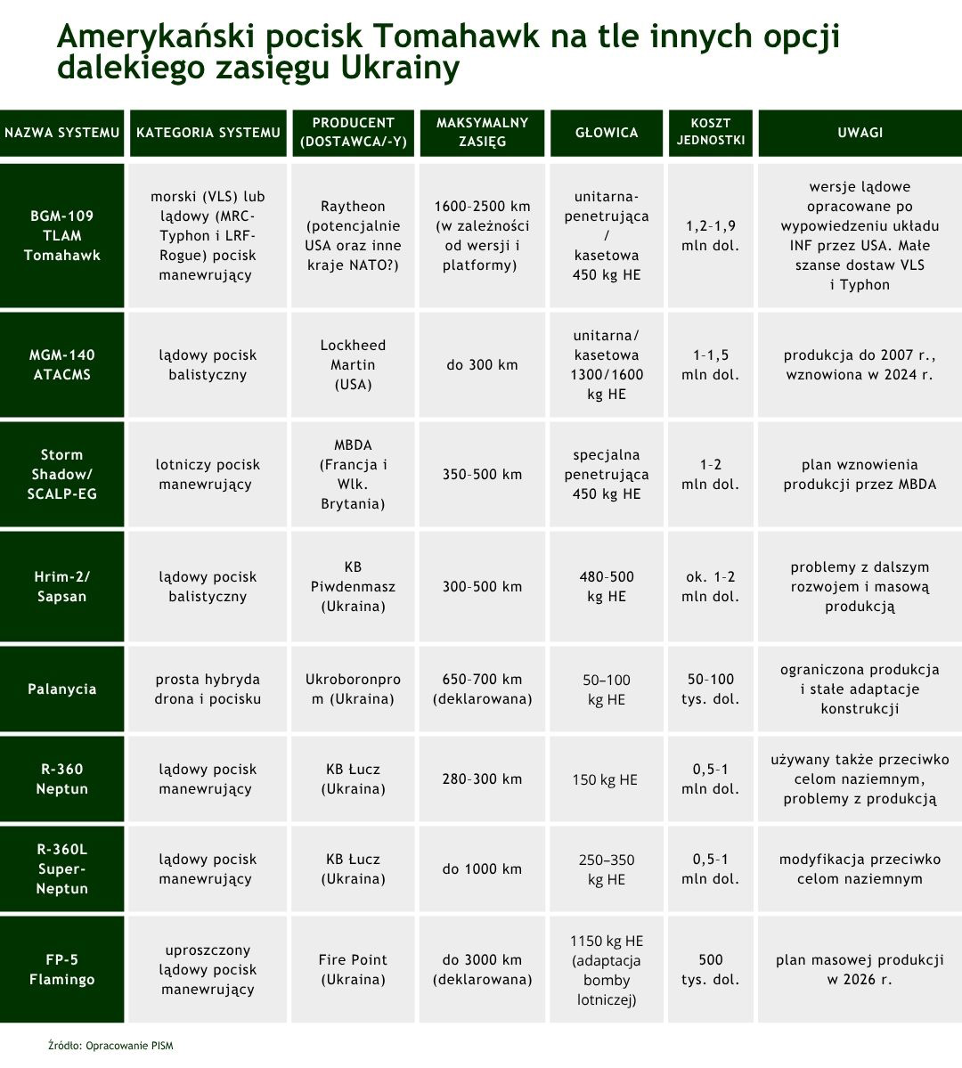 Ukraina wysuwała prośby o dostawy pocisków Tomahawk już wobec administracji Joe Bidena. Temat ten pojawił się też w ostatnich rozmowach prezydentów Wołodymyra Zełenskiego i Donalda Trumpa. Choć pomysł jest forsowany m.in. przez specjalnego doradcę prezydenta USA Keitha Kellogga, to spotyka się z oporem cywilnych urzędników Pentagonu. W zależności od wersji Tomahawki mogą niszczyć dobrze umocnione i chronione cele wojskowe w Rosji w zasięgu 1600 km lub 2500 km. Ukraina nasiliła wprawdzie kampanię uderzeń dronami w sektor naftowy Rosji, ale nie może masowo produkować zaawansowanych pocisków z podobnym zasięgiem i ciężkimi głowicami. Lukę w tych zdolnościach tylko częściowo zapełniają pociski ATACMS i Storm Shadow, używane przeciwko celom położonym do 300 km od linii frontu. Ponieważ jednak arsenał USA został uszczuplony przez operacje w Jemenie i Iranie, dostawy Tomahawków dla Ukrainy byłby zapewne ograniczone do dwóch–trzech wyrzutni LRF-Rogue i kilkudziesięciu pocisków. Ich produkcja, zakup i logistyka mogłyby być sfinansowane przez europejskie państwa NATO. Przekazanie Tomahawków wzmocniłoby pozycję negocjacyjną Ukrainy względem Rosji i byłoby poważną zmianą w podejściu Trumpa do Władimira Putina. Równie istotnym wzmocnieniem dla Ukrainy byłaby ostateczna i wielokrotnie przekładana decyzja Niemiec o transferze pocisków manewrujących Taurus o zasięgu 500 km.