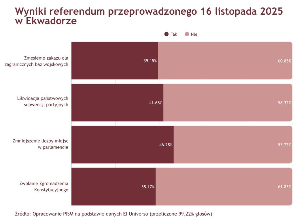 W kwietniu br. Noboa uzyskał reelekcję w wyborach prezydenckich m.in. dzięki popularności swojego podejścia do zwalczania rosnącej przestępczości zorganizowanej, opartego na zaangażowaniu wojska. Rozczarowanie efektami tych działań i trudności gospodarcze wpłynęły na odrzucenie czterech propozycji listopadowego referendum. Rząd zabiegał o zgodę na likwidację subwencji partyjnych, zmniejszenie liczby miejsc w parlamencie, powołanie konstytuanty i zniesienie konstytucyjnego zakazu dla zagranicznych baz wojskowych w Ekwadorze. Brak akceptacji tej ostatniej zmiany komplikuje dążenia Noboi do zacieśnienia współpracy z USA. Administracja Donalda Trumpa liczyła na możliwość przywrócenia obecności swoich sił w ekwadorskiej bazie lotniczej w Manta (ekwadorski rząd rozpoczął prace przygotowawcze pod tym kątem). Żołnierze USA byli tam obecni od 1999 do 2009 r., kiedy rząd Rafaela Correi przeforsował konstytucyjny zakaz ustanawiania zagranicznych baz. Noboa będzie próbował rozwijać współpracę z USA, intensyfikując walkę z grupami narkotykowymi. Wynik referendum może jednak sygnalizować ograniczenia dla społecznej akceptacji metod „twardej ręki” w zapewnianiu bezpieczeństwa publicznego, inspirowanych głównie drakońskim podejściem przywódcy Salwadoru Nayiba Bukele.
