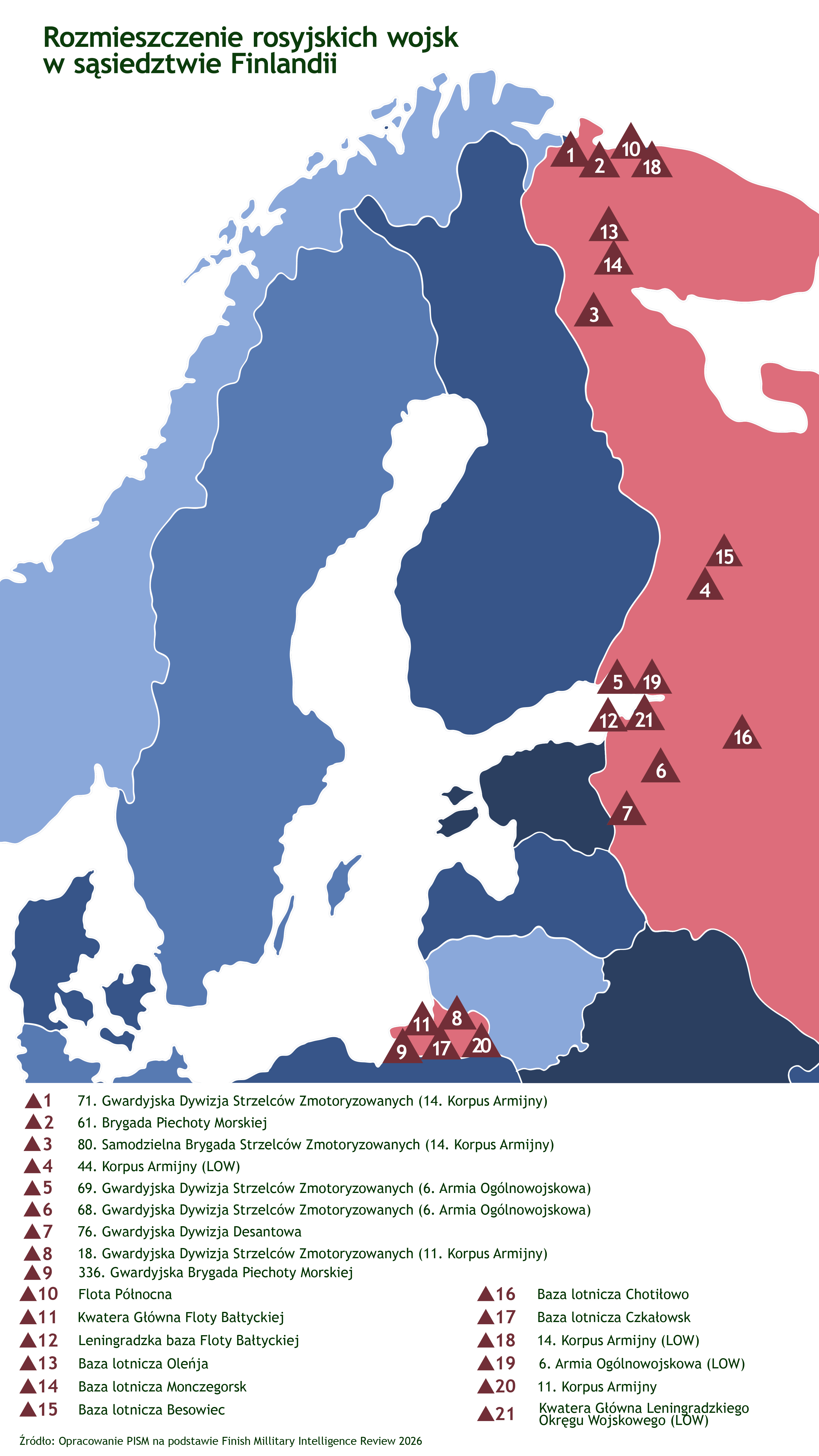 W ocenie fińskiego wywiadu Rosja wykorzystuje negocjacje pokojowe do osłabiania zachodniej determinacji do wspierania Ukrainy. Dzięki przewadze w zakresie rezerw osobowych, produkcji dronów czy wykorzystywania artylerii i bomb szybujących Rosja kontynuuje wojnę na wyniszczenie, co ma zmusić ukraińskie władze do zaakceptowania rosyjskich żądań. Mimo zachodnich sankcji rosyjski przemysł obronny utrzymuje wysoki wolumen produkcyjny (przy obniżonej jakości) dzięki współpracy materiałowo-technicznej z Chinami, Koreą Północną i Iranem oraz gospodarczej z Indiami. Osiągnięcie przez Rosję celów wojennych na Ukrainie umożliwi jej szybką rozbudowę potencjału wojskowego gromadzonego w Leningradzkim Okręgu Wojskowym, co nie będzie jednak stanowić bezpośredniego zagrożenia dla Finlandii w 2026 r. Wojna na Ukrainie utrudnia Rosji proces tworzenia nowych jednostek i wzmacniania brygad (np. w Arktyce) do poziomu dywizji. Przewidywana jest jednak eskalacja sytuacji w regionie Morza Bałtyckiego metodami hybrydowymi, zwłaszcza poprzez akty sabotażu wobec morskiej infrastruktury krytycznej, naruszanie przestrzeni powietrznej i wód terytorialnych, a także zakłócanie swobody żeglugi w wyniku zagłuszania systemów nawigacyjnych i innych incydentów.