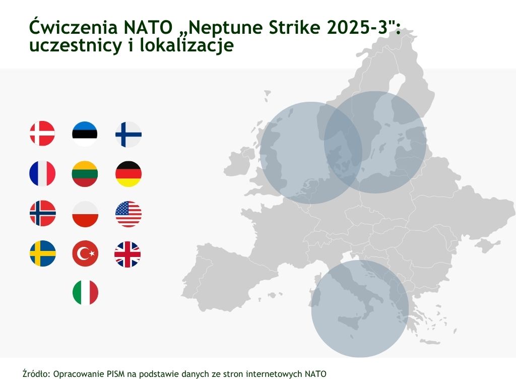 Manewry „Neptune Strike 2025-3” odbyły się w dniach 22–26 września na morzach Północnym, Bałtyckim i Śródziemnym. Wzięło w nich udział ponad 10 tys. marynarzy, lotników i żołnierzy z 13 państw NATO. Sojusz zapoczątkował tę coroczną serię ćwiczeń w 2022 r., po pełnoskalowej inwazji Rosji na Ukrainę. Mają one wzmacniać zdolność członków NATO do współdziałania w złożonych operacjach morskich, a także pomagać w utrzymywaniu sił w stanie podwyższonej gotowości. W ostatnich manewrach wziął udział najnowszy lotniskowiec USA – i zarazem największy obecnie okręt świata – USS Gerald R. Ford. Choć operował na Morzu Północnym, samoloty startujące z jego pokładu prowadziły działania także nad Bałtykiem, w tym nad polskimi wodami. Lotniskowiec i jednostki wchodzące w skład jego eskorty zapewniały większość zdolności uderzeniowych, a ich załogi i stanowiły ok. połowy ćwiczącego personelu. W razie zaangażowania się USA w konflikt w Indo-Pacyfiku takie jednostki amerykańskie najprawdopodobniej nie będą jednak dostępne do udzielenia wsparcia Europie. Jeszcze bardziej zwiększa to potrzebę wzmacniania europejskich zdolności do prowadzenia samodzielnie operacji morskich. Pomocne w realizacji tego celu były przeprowadzone tuż przed „Neptune Strike” polsko-szwedzkie manewry „Gotland Sentry”, podczas których Polska szybko przerzuciła na szwedzką Gotlandię pociski przeciwokrętowe i ponad 100 spadochroniarzy.