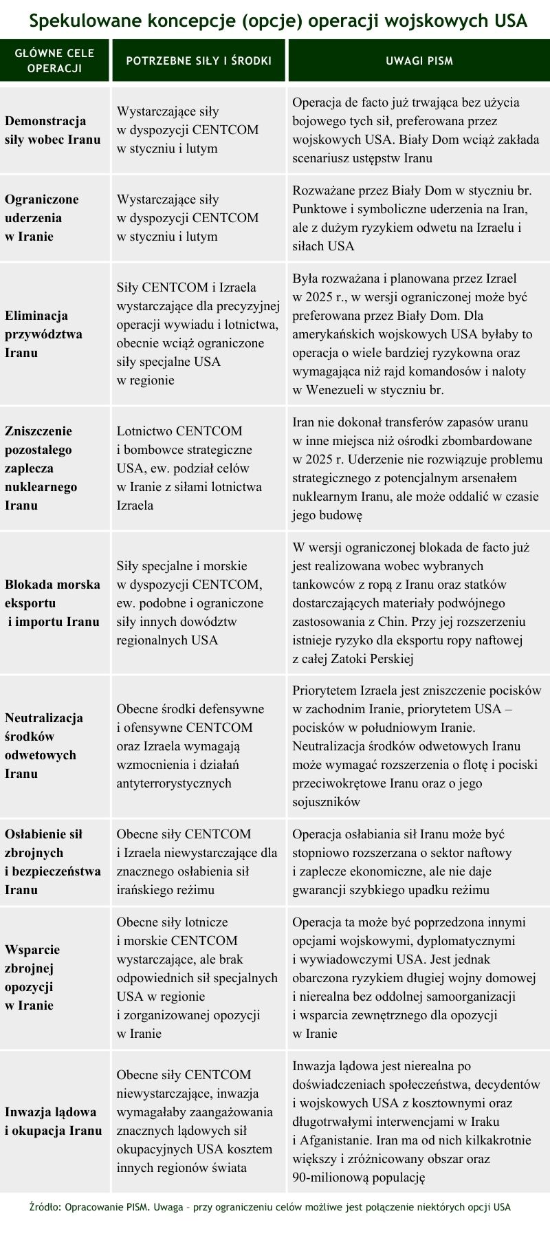 Od brutalnych akcji służb bezpieczeństwa przeciw protestującym w Teheranie (8–9 stycznia br.) prezydent USA wielokrotnie sugerował użycie siły przeciwko władzom Iranu. Równolegle administracja Trumpa wznowiła rozmowy z Iranem na temat ograniczenia jego zaplecza nuklearnego, arsenału rakietowego oraz wsparcia dla radykałów na Bliskim Wschodzie. Mimo spekulacji na temat dostępnych opcji wojskowych (szczegóły w Tabeli) nie doszło dotąd do spotkania Rady Bezpieczeństwa Narodowego USA określającego kierunek działań wobec Iranu. Kolejne dyskusje Trumpa z jego doradcami są nieformalne – bez rozstrzygnięcia celów i skali operacji wojskowej. Siły i środki USA na obszarze Dowództwa Środkowego (CENTCOM), zgromadzone od połowy stycznia do końca lutego br., wydają się niewystarczające dla skutecznej kampanii przeciwko liderom, służbom bezpieczeństwa i arsenałowi rakietowemu Iranu. Niezdecydowanie Trumpa i upływający czas pozwoliły irańskiemu reżimowi na odzyskanie kontroli nad głównymi miastami kraju i lepsze przygotowanie do ewentualnych ataków. Brak jasnych priorytetów politycznych Trumpa wobec Iranu utrudnia całość planowania amerykańskich wojskowych USA. Wraz z analitykami wywiadu starają się oni uświadomić prezydentowi ryzyko eskalacji regionalnej oraz ograniczenia systemów przeciwrakietowych USA i Izraela, które mogą skutkować zwiększonym zagrożeniem atakami rakietowymi i terrorystycznymi niż podczas nalotów na ośrodki nuklearne Iranu w czerwcu 2025 r. W świetle tego, jak funkcjonuje druga administracja Trumpa, nie da się wykluczyć, że podejmie on decyzje w sprawie Iranu wbrew ocenom swoich doradców.