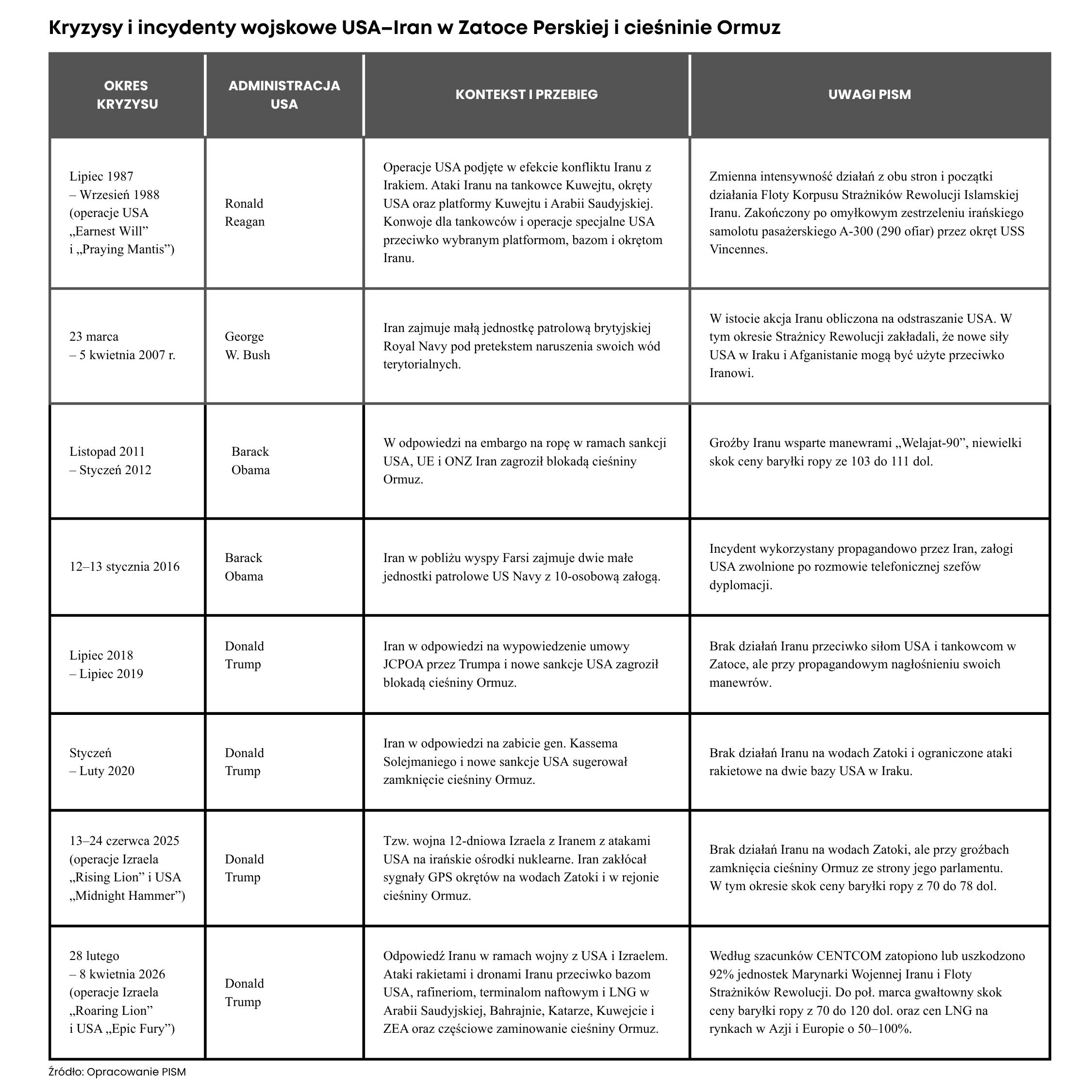 Ogłoszone 8 kwietnia br. zawieszenie broni między USA a Iranem nie zmniejszyło napięcia wokół cieśniny. Przywrócenie swobodnego tranzytu przez ten wąski przesmyk jest drugim, obok programu nuklearnego Iranu, punktem spornym w negocjacjach. Oba państwa mają długą historię kryzysów na wodach Zatoki Perskiej i cieśniny Ormuz, ale żaden nie miał takiej intensywności i tak destabilizującego wpływu na rynek surowców jak obecny (zob. Tabela). Równolegle do nieudanego pierwszego spotkania negocjatorów w Islamabadzie w dniach 11–12 kwietnia (drugie jest planowane na 18–19 bm.) USA wzmacniają swoje siły w sąsiedniej Zatoce Omańskiej o dodatkowy zespół okrętów z lotniskowcem USS George H.W. Bush i trałowcami. Prezydent Donald Trump ogłosił przy tym zamknięcie cieśniny Ormuz, częściowo już zablokowanej irańskimi minami (władze Iranu dotychczas pozwalały na ruch wybranych tankowców głównie z ropą dla Chin). Ponadto dowództwo sił USA w regionie (CENTCOM) zadeklarowało wprowadzenie blokady irańskich portów. Ryzyko wznowienia konfliktu pozostaje wysokie, gdyż obie strony nadal nie wykorzystały pełni swoich zdolności do kontroli akwenu. Perspektywa takiego scenariusza hamuje aktywność dyplomatyczną i wojskową sojuszników USA, którzy nie chcą się uwikłać w otwartą i długotrwałą wojnę z Iranem. Mimo wysokich strat Iran zachowuje wciąż niewykorzystane zdolności do minowania, ataków pociskami manewrującymi i dronami lub sabotażu tankowców. W połączeniu z podobnymi możliwościami i sprawdzoną taktyką proirańskich Hutich w Jemenie (blokada Morza Czerwonego i Suezu) może to usztywniać stanowisko Iranu w negocjacjach z USA.