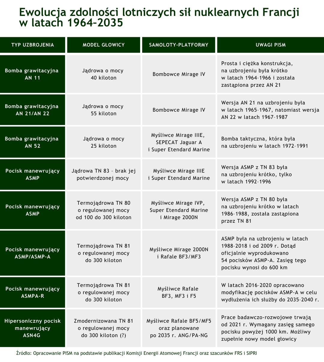 Pocisk ASMP-R od 2023 r. wchodzi na uzbrojenie Lotnictwa Strategicznego Sił Powietrznych i Lotnictwa Nuklearnego Marynarki Wojennej Francji. Ma głowicę termojądrową o mocy do 300 kiloton, zasięg do 500 km i może osiągać prędkość do 3 Ma, a przenoszą go samoloty Rafale o zasięgu 2000 km. Francuskie jednostki posiadają obecnie 50–55 pocisków w wersji ASMP-A, a publikacja nowego i wciąż częściowo ocenzurowanego zdjęcia ASMPA-R służy sygnalizowaniu wiarygodności arsenału nuklearnego Francji (łącznie 290–300 głowic) wobec Rosji, która wykorzystuje posiadany arsenał jądrowy do wywierania presji psychologicznej na Europę i USA. Ponadto wiosną br. Francja ogłosiła utworzenie do 2035 r. dwóch nowych dywizjonów z Rafale w wersji F5 i pociskami ASMPA-R. W 2035 r. planuje też przezbrojenie tych samolotów w pierwsze pociski hipersoniczne ASN4G. Niejasne pozostają ewentualne plany dalszej rozbudowy arsenału Francji w ciągu najbliższej dekady, gdyż wymagałoby to dodatkowych inwestycji w nowe środki przenoszenia oraz zwiększenia produkcji plutonu i trytu dla głowic. Takie kroki mogą być jednak konieczne w razie nasilenia się izolacjonistycznych tendencji w USA i redukcji ich sił nuklearnych w Europie.