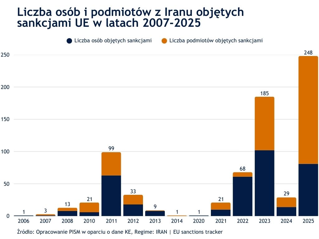 Decyzja ta oznacza wyraźne zaostrzenie stanowiska Unii wobec władz Iranu. Dotychczas UE stawiała na dialog, licząc na porozumienie w kwestii irańskiego programu jądrowego, jednak skala represji wymusiła jednoznaczną reakcję. Nawet początkowo sceptyczne państwa, jak Francja czy Włochy, ostatecznie poparły sankcje. Nowe restrykcje mają głównie wymiar polityczny, gdyż obejmują niewielką grupę osób i podmiotów odpowiedzialnych za łamanie praw człowieka. UE zamroziła aktywa 15 osób – w tym ministra spraw wewnętrznych i prokuratora generalnego, objętych także zakazem wjazdu – oraz 6 firm i instytucji. Dodatkowe sankcje nałożono na 10 osób i podmiotów za udział w irańskim programie dronów i rakiet. Dotychczasowe restrykcje UE przyjęte do końca 2025 r. za łamanie praw człowieka, wsparcie wojenne dla Rosji oraz grup zbrojnych na Bliskim Wschodzie i Morzu Czerwonym, a także za proliferację broni jądrowej obejmują 732 osoby i podmioty. Największe znaczenie ma jednak uznanie KSRI – części irańskich sił zbrojnych – za organizację terrorystyczną, co oznacza kryminalizację kontaktów z nią w UE oraz zwiększenie współpracy policyjnej i sądowej państw członkowskich. W odpowiedzi władze Iranu uznały armie państw UE za organizacje terrorystyczne.