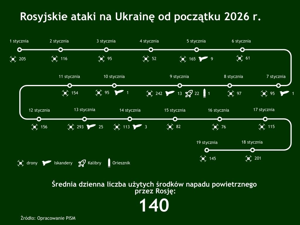 Od początku stycznia Rosja używa średnio 140 środków napadu powietrznego (drony, rakiety różnego typu) podczas jednego uderzenia. Wybór celów oraz moment intensyfikacji ataków (na Ukrainie trwają silne mrozy) wskazują, że mają one wywołać presję społeczną poprzez pogłębianie kryzysu humanitarnego. Jest to tym bardziej istotne, że Ukraina ma coraz większy problem z odbudową stacji przesyłowych oraz elektrowni i elektrociepłowni. Sprawia to, że przerwy w dostawach prądu i ciepła są coraz dłuższe. Najtrudniejsza sytuacja jest w Kijowie, gdzie kilkaset budynków od ponad tygodnia pozostaje bez ogrzewania. Mer Witalij Kliczko zaapelował do mieszkańców, którzy mają taką możliwość, o tymczasowe opuszczenie miasta, jednak nie jest planowana jego ewakuacja. Z powodu kryzysu energetycznego w stolicy przedłużone zostały też ferie zimowe dla uczniów. Celem rosyjskich ataków jest też ograniczenie zdolności produkcyjnych ukraińskiego przemysłu obronnego, którego potencjał wyniósł w ostatnim roku 35 mld dol. (w 2022 r. był szacowany na 1 mld dol.). Rosja dąży tym samym do jednoczesnego osłabienia odporności społeczeństwa i spowolnienia produkcji, zwłaszcza przedsiębiorstw zbrojeniowych. Chociaż sytuacja jest trudna, Ukraina odbudowuje zniszczoną infrastrukturę. Planuje też zorganizować „energetyczny Ramstein”, aby pozyskać dodatkowe wsparcie na rzecz odbudowy tego sektora. Minister spraw zagranicznych Andrij Sybiha wskazał, że pomoc powinna objąć fundusze na zakup sprzętu energetycznego i dalsze wzmocnienie zdolności obrony powietrznej.