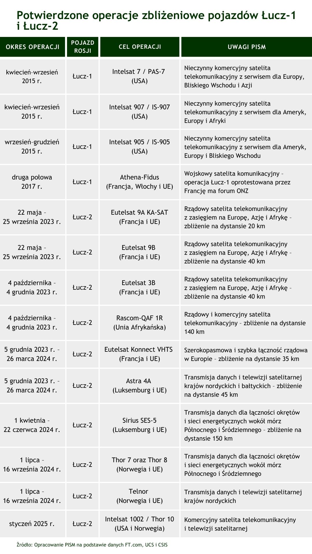 Artykuł podsumowuje obserwowaną od 2023 r. przez europejskie rządy, ich agencje i firmy prywatne aktywność rosyjskiego pojazdu Łucz-2 (Olimp-K2). Podobnie jak wcześniejszy i niedawno dezaktywowany Łucz-1 (Olimp-K, operował od 2014 r.), został on umieszczony i operuje na orbitach geostacjonarnych Ziemi. Ważące ok. 3 ton pojazdy rodziny Łucz dysponują własnym napędem, co pozwala im manewrować, zmieniać położenie i ,,parkować” dłuższy czas w pobliżu innych satelitów lub pojazdów. Potwierdzeniem ich zadań na rzecz Federalnej Służby Bezpieczeństwa i Ministerstwa Obrony Rosji były kolejne manewry wokół co najmniej 14–15 europejskich satelitów (zob. Tabela). Łucz-2 może mieć środki wywiadu radioelektronicznego (SIGINT) do przechwytywania sygnałów kontrolnych oraz szyfrowanej łączności rządowej i komercyjnej z innych satelitów. Takie systemy, poza zebranymi informacjami, Rosji dają cenne doświadczenie w prowadzeniu wojny hybrydowej również w kosmosie. Od lutego 2022 r. Rosja nasiliła też ataki cybernetyczne lub elektroniczne na zachodnie satelity i terminale naziemne, służące władzom cywilnym i armii Ukrainy. Jeszcze przed pełnoskalową agresją, w 2021 r., zademonstrowała zdolności kinetyczne w kosmosie przy okazji testu pocisku antysatelitarnego Nudol. Ponadto w 2024 r. wywiad i Kongres USA ujawniły, że Rosja pracuje nad pojazdem mogącym umieścić na niskiej orbicie Ziemi głowicę nuklearną do zniszczenia setek satelitów cywilnych i wojskowych. Dalszy jego rozwój i testy byłyby jednak złamaniem obowiązującego międzynarodowego prawa kosmicznego.
