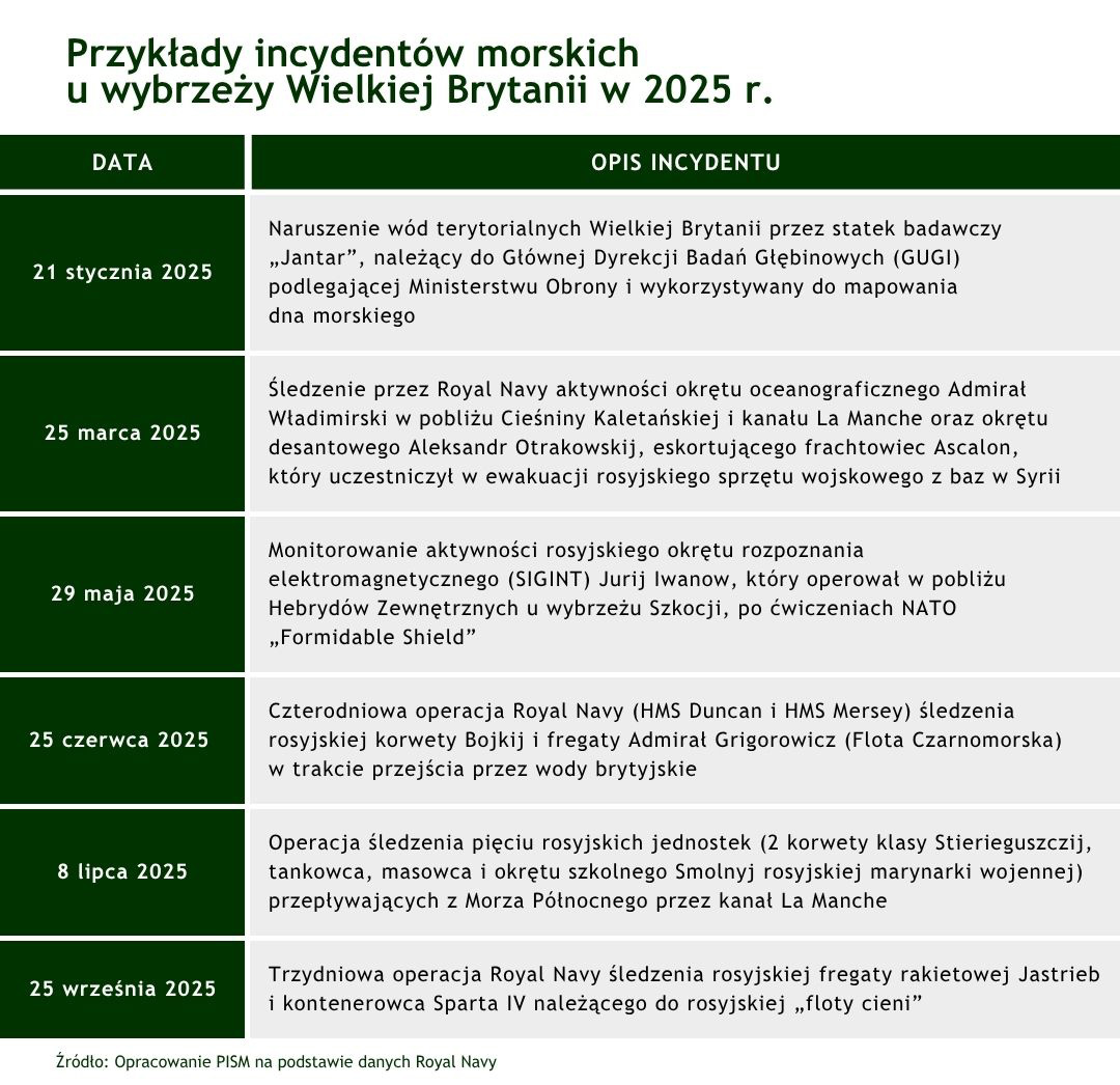 22 października br. rosyjski niszczyciel rakietowy Wiceadmirał Kułakow z Floty Północnej wpłynął na brytyjskie wody terytorialne, gdzie został przechwycony przez okręt Royal Navy HMS Duncan. W operacji Dowództwa Morskiego NATO w Northwood uczestniczyły także holenderskie siły powietrzne i francuska marynarka wojenna. Wspólna reakcja pozwoliła na sprawdzenie procedur operacyjnych i demonstrację gotowości sojuszników do kolektywnej obrony na morzach. Incydent ten był kolejnym z serii – od 2022 r. na wodach brytyjskich miało miejsce ponad 40 tego typu prowokacji wskazujących, że Rosja prowadzi działalność wywiadowczą ukierunkowaną na mapowanie podwodnej infrastruktury i rozpoznawanie portów wojennych. Ponadto rosyjskie okręty wojenne przepływające przez kanał La Manche często eskortują statki „floty cieni” wykorzystywane do transportu uzbrojenia i ropy naftowej z ominięciem zachodnich sankcji, jak i do sabotażu. Z kolei 23 października br. rosyjski myśliwiec Su-30 i cysterna Ił-78, które naruszyły litewską przestrzeń powietrzną od strony obwodu królewieckiego, zostały przechwycone przez hiszpańskie samoloty Eurofighter Typhoon działające w ramach misji NATO Baltic Air Policing. Naruszenie trwało zaledwie 38 sekund i nie może być porównywalne z ostatnim incydentem w Estonii, co wskazuje na to, że ówczesna zdecydowana reakcja wpłynęła na kalkulacje Rosji i tymczasowo obniżyła jej skłonność do podejmowania wysokiego ryzyka. Powstrzymanie się USA od dostarczenia Ukrainie pocisków Tomahawk wskazuje jednak na skuteczność rosyjskiego szantażu metodami hybrydowymi, co oznacza, że należy się liczyć z kolejnymi rosyjskimi prowokacjami.