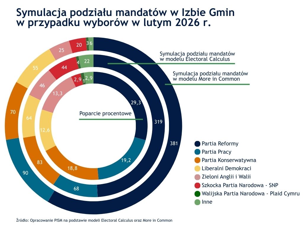 Prowadząca obecnie w sondażach z poparciem ok. 30% prawicowo-populistyczna Partia Reformy pod przywództwem Nigela Farage’a wykorzystuje transfery w partiach establishmentowych do budowy swojej wiarygodności jako siły zdolnej do rządzenia państwem. Po raz pierwszy w historii brytyjskiej demokracji kryzys jednego z dwóch głównych ugrupowań zbiega się z kryzysem drugiego (poparcie po ok. 18%). Od wyborów w lipcu 2024 r. Partia Pracy straciła połowę poparcia. Napięcia w tym ugrupowaniu uwypukliły się przed nadchodzącymi wyborami uzupełniającymi w okręgu Gorton, zarządzonymi po skazaniu posła laburzystowskiego za pobicie wyborcy. Władze partii zablokowały kandydaturę Andy’ego Burnhama, popularnego burmistrza Manchesteru, obawiając się uruchomienia przez niego procedury zmiany przywódcy partii po uzyskaniu mandatu posła. W efekcie kampania w okręgu obsadzanym przez laburzystów od 1935 r. została zdominowana przez partie Reformy i Zielonych. Zwycięstwo dowolnego z tych ugrupowań pogłębi postępujący kryzys obu tradycyjnie dominujących ugrupowań przed nadchodzącymi wyborami samorządowymi w Anglii i krajowymi w Walii i Szkocji 7 maja br.