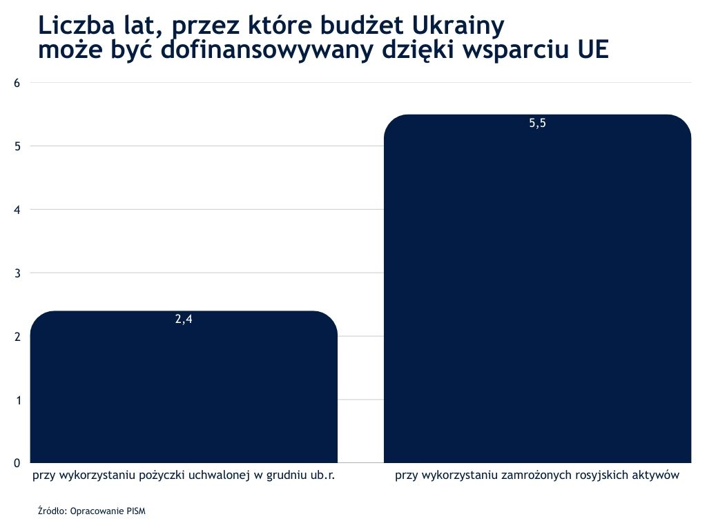 Bez pożyczki, której udzielenie uzgodniła Rada Europejska 18–19 grudnia ub.r., Ukraina byłaby zdolna do obsługi zadłużenia jedynie do końca kwietnia 2026 r. Jeżeli wpływy i wydatki budżetowe Ukrainy pozostaną na podobnym poziomie, pożyczka zapewni jej finansowanie także na cały 2027 r. i to nawet w razie kontynuacji wojny przez Rosję, gdyż ukraiński deficyt budżetowy to ok. 38 mld euro. Z perspektywy UE uzgodnione rozwiązanie nie jest całkiem optymalne, bo wymaga zaciągnięcia wspólnego długu, a więc ostatecznie zwiększenia przez państwa Unii własnego zadłużenia (z wyjątkiem Czech, Słowacji i Węgier, które odmówiły udzielenia wsparcia). Korzystniejsze byłoby wykorzystanie tzw. zamrożonych rosyjskich aktywów państwowych (ok. 210 mld euro), co postulowały zwłaszcza państwa bałtyckie, skandynawskie, Holandia, Polska i Niemcy. Opór stawiła jednak Belgia, na której terytorium zlokalizowanych jest ok. 85% środków i która obawiała się kroków prawnych ze strony Rosji. Dzięki poparciu m.in. Francji i Włoch oraz części państw Europy Środkowej, które są niechętne wspieraniu Ukrainy, Belgii udało się zebrać mniejszość blokującą. Nic nie stoi jednak na przeszkodzie, by UE podjęła jeszcze w przyszłości decyzję o wykorzystaniu rosyjskich środków, co podkreślił w ostatnich dniach m.in. szef największej frakcji w Parlamencie Europejskim – EPL – Manfred Weber.