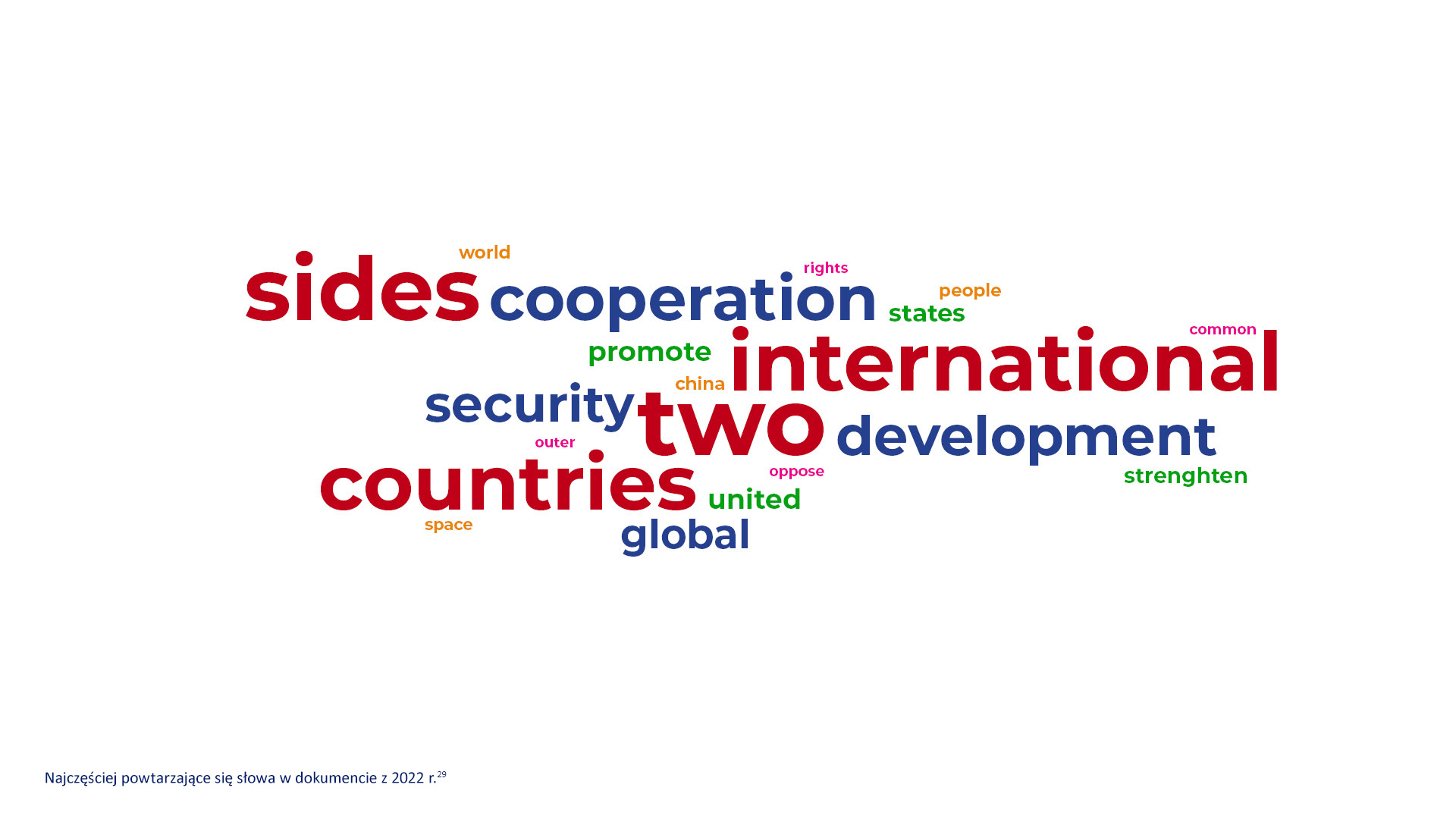 Dynamikę zmian zachodzących w relacjach chińsko-rosyjskich odzwierciedla analiza słów użytych w dokumentach z ostatnich lat. Dominują w nich określenia odnoszące się do koordynacji polityki Chin i Rosji („międzynarodowy” „współpraca”, „dwa państwa”), a także wskazujące najważniejsze obszary kooperacji („bezpieczeństwo”, „rozwój”). Częściej niż Rosję w tekstach wymienia się z nazwy Chiny. Jest to sygnałem przewagi Chińskiej Republiki Ludowej w tej relacji, zarówno pod kątem najpierw zdolności do narzucania swojej wizji tej współpracy, a później realizacji politycznych planów, jak i podzielanej przez oba państwa wizji stosunków międzynarodowych, w których kluczowym zagrożeniem dla obu reżimów jest działanie Zachodu (czyli USA i ich partnerów). Tę dominację Chin odzwierciedlają też częste stosowanie retoryki ChRL i liczne odniesienia do chińskich inicjatyw politycznych.