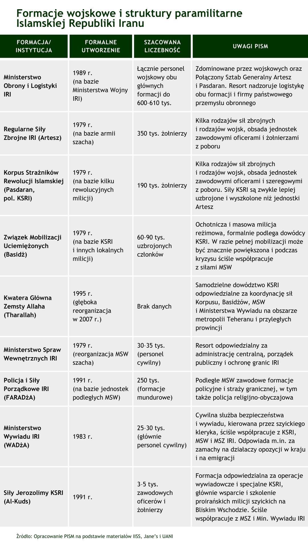 Krwawo tłumione protesty w Teheranie pokazały pełną lojalność blisko miliona członków różnych sił wojskowych, paramilitarnych i porządkowych Iranu (zob. Tabela) wobec reżimu. Kluczowe dla odzyskania kontroli nad stolicą są jednostki Korpusu Strażników Rewolucji Islamskiej (KSRI), ochotniczej milicji Basidżów i siły policyjne MSW. Jak dotąd brak jest potwierdzonych informacji o użyciu wraz z nimi jednostek regularnej armii Iranu. Coraz bardziej prawdopodobne są jednak doniesienia o wykorzystaniu przez reżim ochotników z proirańskich milicji z Iraku, Afganistanu i Pakistanu, dowodzonych przez tzw. Siły Jerozolimy KSRI. Przy braku wsparcia USA dla protestujących władze zapewne opanowałyby sytuację w innych miastach i prowincjach Iranu, dławiąc też lepiej zorganizowany opór mniejszości Kurdów i Beludżów. Dalszy rozwój sytuacji w Iranie może więc zależeć od spełnienia gróźb wojskowych USA, które nie zakończyły jeszcze gromadzenia dodatkowych sił w Zatoce Perskiej, Jordanii i Izraelu. W ostatnich dniach władze Iranu deklarują chęć uniknięcia konfrontacji z USA i wznowienia rozmów nuklearnych, co promują Turcja, Arabia Saudyjska, Zjednoczone Emiraty Arabskie i Rosja. Wcześniejsze deklaracje prezydenta USA o wsparciu protestujących oraz mała elastyczność i względy prestiżowe po stronie Iranu mogą jednak utrudnić szybkie osiągnięcie rozwiązań dyplomatycznych. Należy podkreślić, że siły bezpieczeństwa i armia Iranu miałyby poważne problemy z równoległym odparciem dłuższej kampanii nalotów USA i Izraela oraz z pełną pacyfikacją kolejnych fal protestów przeciwko reżimowi – zwłaszcza przy braku perspektyw dla zniesienia sankcji i poprawy sytuacji ekonomicznej kraju.