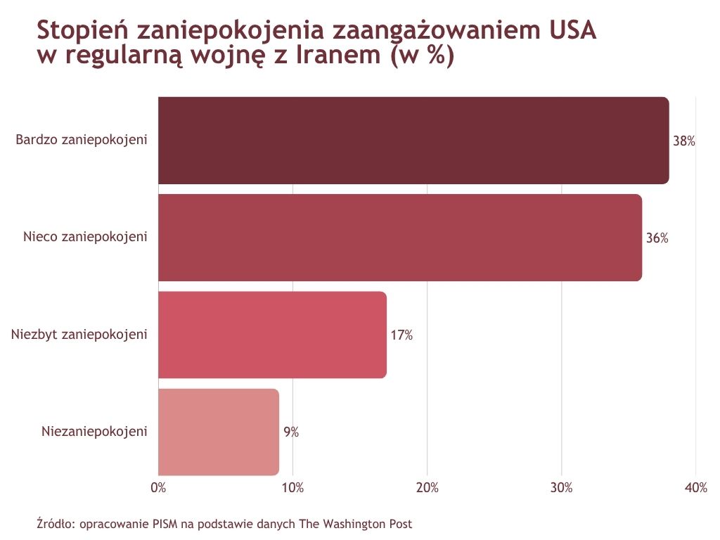 Decyzja prezydenta Donalda Trumpa stoi w sprzeczności z jego deklarowaną polityką nieinterwencjonizmu, szczególnie unikania zaangażowania w nowe wojny. Atak na Iran spotkał się z natychmiastową reakcją członków Kongresu, nie tylko Demokratów, ale także części polityków Partii Republikańskiej, z uwagi na brak konsultacji z parlamentem. Jednak znacząca większość Republikanów, którzy sprawują kontrolę nad obiema izbami Kongresu, wsparła decyzję i działania Trumpa, co sprawia, że wtórne działania władzy ustawodawczej są mało prawdopodobne. Wyłom części środowiska MAGA, która zdecydowanie sprzeciwia się zaangażowaniu militarnemu USA w konflikty – zwłaszcza te, które wiążą się z bezpośrednim zagrożeniem dla Stanów Zjednoczonych – może istotnie wpływać na kolejne decyzje administracji Trumpa dotyczące wykorzystania amerykańskich wojsk na świecie. Jednocześnie w środowisku tym narasta przekonanie, że rząd Benjamina Netanjahu podżega administrację Trumpa do udziału w izraelskich działaniach zbrojnych na Bliskim Wschodzie. Na postawę izolacjonistyczną amerykańskich polityków będzie wpływać opinia publiczna, która zgodnie z badaniami wyraża obawę przed zaognieniem się konfliktu, a co za tym idzie – zaangażowaniem USA, i nie zgadza się z decyzją o użyciu siły.