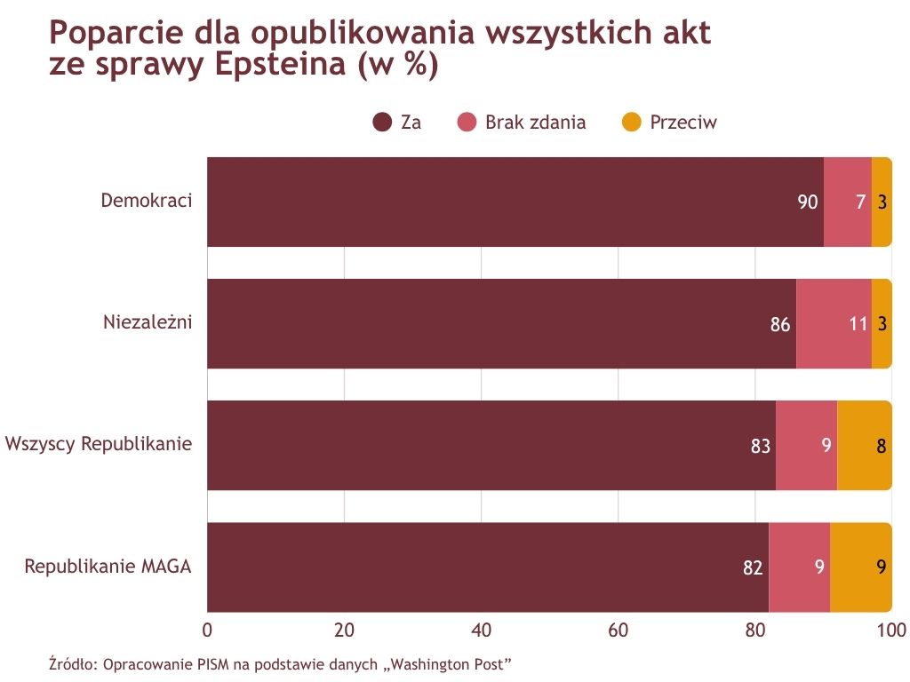 Lista Epsteina to przyczyna największego kryzysu drugiej kadencji Trumpa, podważającego zaufanie wyborców do prezydenta i całej Partii Republikańskiej. Polityczne znaczenie tej sprawy uwypukla decyzja Johnsona, wynikająca z głębokich napięć pomiędzy Republikanami. Partię podzielił wewnętrzny konflikt między zwolennikami ochrony wizerunku i dobrego imienia prezydenta, a tymi, którzy są przychylni rosnącym naciskom na przejrzystość i odpowiedzialność ze strony wyborców, szczególnie utożsamiających się z ruchem MAGA. Sprawa Epsteina stanowiła paliwo polityczne dla Trumpa i skrajnych Republikanów w zeszłorocznej kampanii wyborczej, podczas której kładli nacisk na opublikowanie wszystkich związanych z nią dokumentów, w tym tzw. listy klientów. Jej istnienie potwierdziła w lutym br. prokurator generalna Pam Bondi, jednak obecnie wstrzymuje ona Departament Sprawiedliwości od działania. Budzi to wątpliwości co do ewentualnego tuszowania przez nią sprawy. Dotychczasowe próby odwrócenia uwagi opinii publicznej nie przyniosły rezultatów, dlatego niewykluczone, że administracja lub – co bardziej prawdopodobne – Kongres będą zmuszone doprowadzić do większej przejrzystości. Osłabienie zaufania wyborców może nieść konsekwencje dla Republikanów przed wyborami połówkowymi do Kongresu w listopadzie 2026 r.