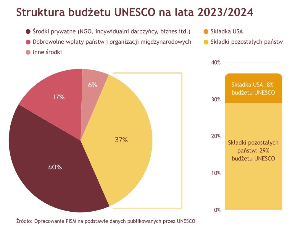 Decyzja ta została uzasadniona trwającym od 2011 r. członkostwem Palestyny w UNESCO jako państwa. Ma się to przyczyniać do szerzenia antyizraelskiej retoryki w organizacji, zbyt dużego nacisku kładzionego na realizację celów zrównoważonego rozwoju ONZ i działań na rzecz rodzących podziały kwestii społecznych i kulturowych. Inaczej niż np. w przypadku WHO decyzja USA nie spowoduje poważniejszych konsekwencji dla UNESCO – w ostatnich latach mocno zrestrukturyzowała ona swoje źródła finansowania i amerykańska składka stanowi dla niej tylko 8% wpływów. Nadal będzie też możliwa współpraca organizacji z amerykańskimi uczelniami i sektorem prywatnym. Decyzja administracji Trumpa wpisuje się w intensyfikację działań USA wspierających politykę Izraela na arenie międzynarodowej. Należy do nich m.in. objęcie sankcjami sędziów Międzynarodowego Trybunału Karnego zaangażowanych w postępowania dotyczące izraelskich polityków oraz specjalnej sprawozdawczyni ONZ ds. okupowanych terytoriów palestyńskich Franceski Albanese. Zgodnie z regulacjami UNESCO Stany Zjednoczone przestaną być jej członkiem z końcem 2026 r. Będzie to już trzecie wyjście z organizacji – wcześniej opuszczały ją podczas prezydentury Ronalda Reagana i pierwszej prezydentury Trumpa.