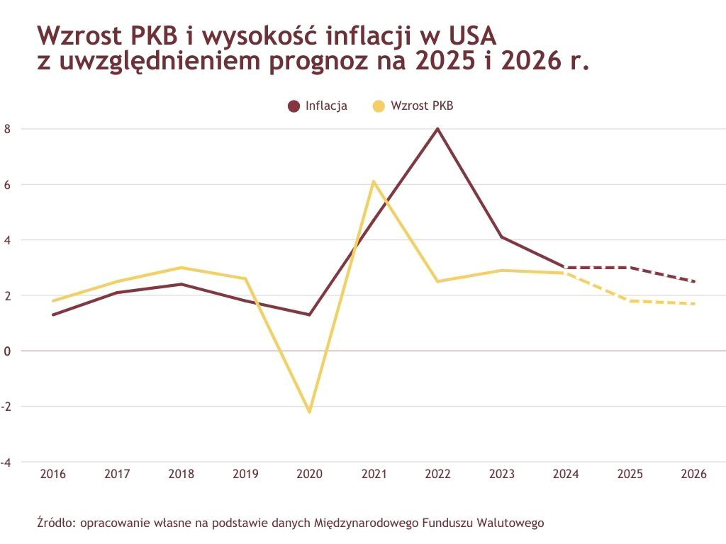 Bariery celne między USA i ChRL na obecnym poziomie doprowadzą do niemal całkowitego zatrzymania handlu między stronami, poza produktami wyłączonymi z ceł i tymi, których nie da się zastąpić importem z innych krajów. Poskutkuje to co najmniej krótkoterminowym spadkiem tempa wzrostu. Sposób wprowadzenia nowej polityki handlowej USA został negatywnie przyjęty przez uczestników rynku, którym trudno działać w sytuacji dużej niepewności i zmienności co kilka dni. Ewentualne spowolnienie gospodarcze będzie problemem zwłaszcza w połączeniu z możliwym wpływem nowych ceł na wzrost inflacji, gdyż zjawiska te wymagałyby przeciwstawnej reakcji w zakresie polityki monetarnej. Ilościowa prognoza MFW ma charakter gospodarczy i nie uwzględnia politycznych możliwości dokonywania przez amerykańską administrację szybkich i zasadniczych zmian w stosowaniu ceł. Z uwagi na duże koszty utrzymania ich obecnego poziomu jest mało prawdopodobne, że sprawdzi się skala przewidywanego spowolnienia. Bardziej realistyczne są działania deeskalacyjne, takie jak wprowadzone już zawieszenie części ceł na produkty elektroniczne. Ewentualne kolejne obniżki ceł i wyłączenia produktów pozwolą na szczegółową analizę przyczyn potencjalnej zmiany kursu przez administrację Donalda Trumpa.