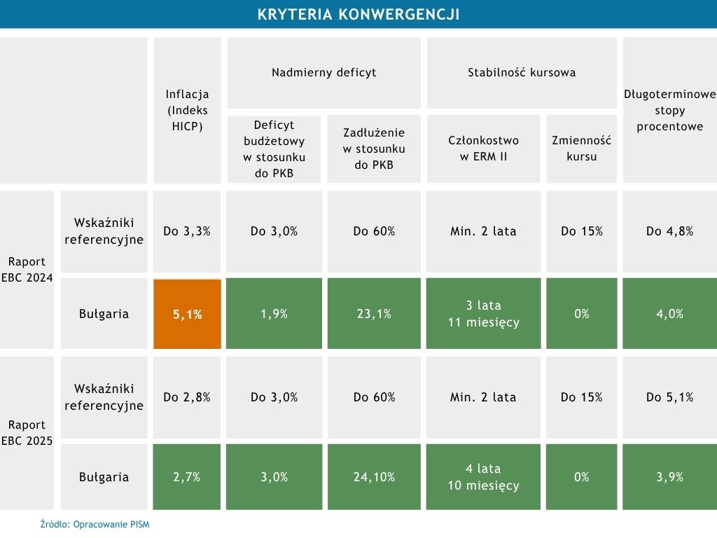 Dodatkowy raport – przygotowany na wniosek rządu Żelazkowa z lutego br. – poświadcza spełnienie przez Bułgarię warunków stabilności makroekonomicznej, wymaganych Traktatem o funkcjonowaniu UE, w celu przystąpienia do strefy euro. Obecnie obejmują one utrzymanie poziomu inflacji do 2,8% (w Bułgarii jest 2,7%), deficytu budżetowego do 3% PKB (3%), zadłużenia do 60% PKB (24%), długoterminowej stopy procentowej do 5,1% (3,9%), a także stabilności waluty krajowej wobec euro w granicach ± 15% przez dwa lata. Trwające od lipca 2020 r. członkostwo w mechanizmie kursów walutowych ERM II nie jest dla Bułgarii wyzwaniem, gdyż lew związany jest sztywnym kursem z euro (1,95583:1) od 1999 r. Akcesja tego państwa wymaga jednogłośnej zgody Rady UE w składzie ministrów finansów państw strefy – zaplanowane na lipiec br. głosowanie najpewniej będzie formalnością, gdyż żaden z krajów nie kontestuje dążeń Bułgarii. Problemem nie powinno być także konieczne określenie kursu wymiany – najpewniej zostanie potwierdzony obecny kurs sztywny. Ryzyko powstrzymania akcesji przez czynniki wewnątrzbułgarskie jest znikome po zablokowaniu w maju br. przez Zgromadzenie Narodowe wniosku prezydenta o rozpisanie referendum w tej sprawie.