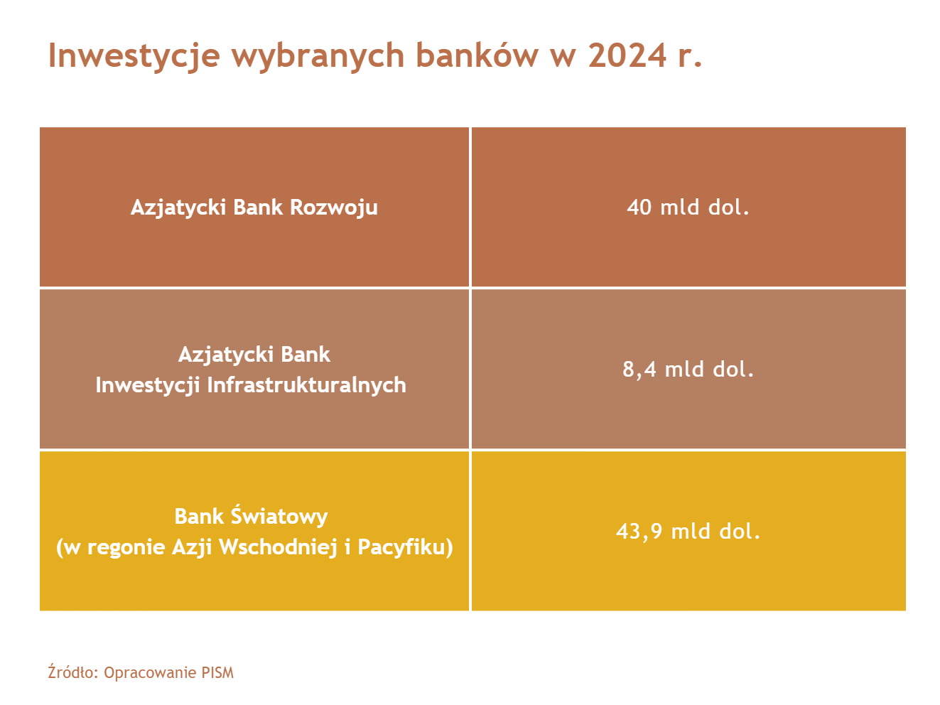 Członkostwo Kuwejtu (szóstego państwa z Zatoki Perskiej) to wyraz intensyfikacji kontaktów Chin z państwami arabskimi, o której świadczy szereg deklaracji współpracy dotyczących rozbudowy infrastruktury, sektora energetycznego i logistyki podpisanych w ostatnich latach. Tymi obszarami interesuje się także AIIB jako możliwymi do finansowania. Sam bank, choć stara się demonstrować neutralność – choćby wycofując się w 2022 r. z projektów w Rosji i Białorusi po pełnoskalowej agresji na Ukrainę – jest ważnym instrumentem politycznym ChRL w rozwoju relacji z państwami tzw. Globalnego Południa, ale także Bliskiego Wschodu. Pierwsza filia AIIB poza Chinami powstała w 2023 r. w Zjednoczonych Emiratach Arabskich. Jego rola ekonomiczna, jako podmiotu finansującego projekty rozwojowe (do tej pory na kwotę ok. 60 mld dol.), pozostaje nadal ograniczona w porównaniu z Azjatyckim Bankiem Rozwoju.