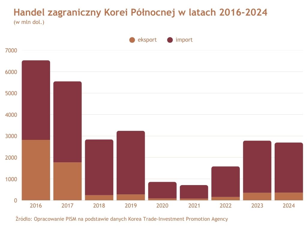 Raporty banku centralnego Korei Płd. uważane są za najbardziej rzetelne źródło informacji o gospodarce Korei Płn., która nie publikuje danych ekonomicznych. Są one jednak obarczone dużym ryzykiem błędu ze względu na niemożność zweryfikowania szacunków, bazujących na analizie m.in. zdjęć satelitarnych i danych handlowych innych państw. Nie uwzględniają też handlu uzbrojeniem (szczególnie istotnego od 2023 r. w stosunkach Korei Płn. z Rosją) i ataków cybernetycznych (w latach 2017–2023 hakerzy KRLD mieli wykraść kryptowaluty o wartości ok. 3 mld dol.). Według Banku Korei PKB Korei Płn. w 2024 r. wyniósł 26,6 mld dol., co stanowi zaledwie 1,7% PKB Korei Płd. Za poprawę sytuacji w sektorach produkcyjnym i budowlanym mogły odpowiadać projekty realizowane w ramach programu rozwoju potencjału przemysłowego w różnych regionach kraju (tzw. plan 20x10). Z kolei dostawy amunicji i uzbrojenia do Rosji mogły przełożyć się na zwiększenie produkcji w przemyśle ciężkim i chemicznym. Czynnikiem stabilizującym sytuację północnokoreańskiej gospodarki może być zwiększenie wartości handlu zagranicznego, który zbliżył się do skali sprzed pandemii. Chiny pozostają największym partnerem handlowym KRLD, odpowiadając za 98% jej wymiany handlowej.