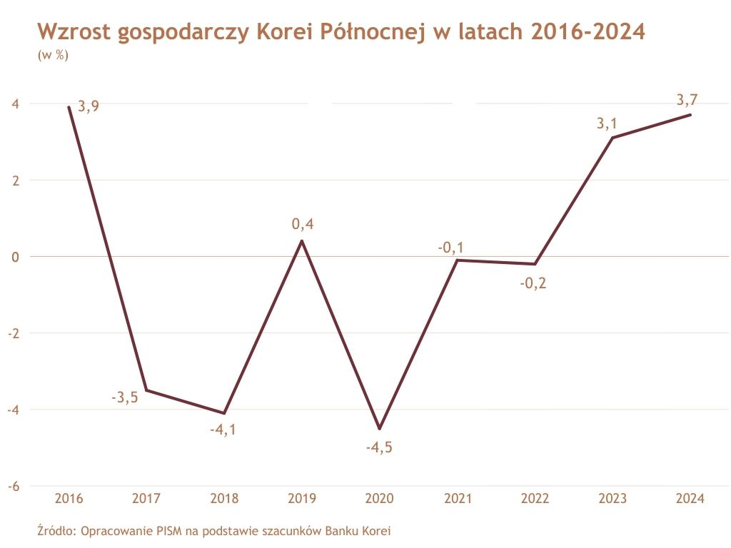 Według szacunków południowokoreańskiego Banku Korei w 2024 r. Korea Płn. odnotowała najwyższy od ośmiu lat wzrost gospodarczy (3,7%), na co wpływ mogło mieć pogłębienie współpracy z Rosją.