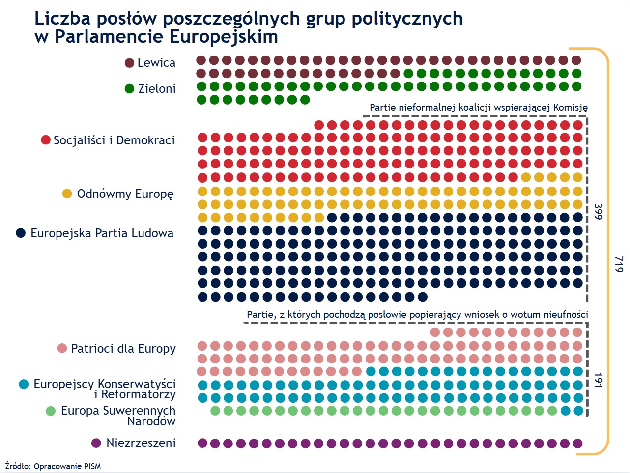 Pod wnioskiem podpisało się 74 parlamentarzystów (wymaganych było 72), z czego 32 z EKR (40% tej grupy). Szanse jego przyjęcia przez PE są znikome, ponieważ potrzeba do tego większości 2/3 głosów. Jego złożenie uwidacznia jednak skomplikowane relacje prawicy skupionej w EKR z przewodniczącą KE. Z jednej strony partia pozycjonuje się jako ugrupowanie krytyczne wobec flagowych polityk przewodniczącej, takich jak Zielony Ład, z drugiej poprzez dobre relacje z von der Leyen oraz konstruktywne wsparcie projektów uznanych za wartościowe stara się mieć wpływ na kierunek rozwoju Unii. Wniosek o wotum zbiegł się z konfliktem w łonie nieformalnej koalicji popierającej aktualną KE – składającej się z Europejskiej Partii Ludowej (EPL), Socjalistów i Demokratów (SD) oraz partii Odnówmy Europę (OE). KE zapowiedziała wycofanie dyrektywy o tzw. pseudoekologicznym marketingu (greenwashing), co wywołało sprzeciw SD i OE, które zagroziły nawet zaprzestaniem popierania Komisji. Jednak po pojawieniu się informacji o możliwym wotum, przedstawiciele tych ugrupowań zadeklarowali, że będą głosowali przeciw takiemu wnioskowi, aby nie wspierać inicjatyw skrajnej prawicy.
