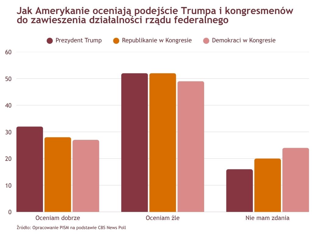 Republikanie kontrolują obie izby Kongresu, jednak do poddania projektu pod głosowanie w Senacie muszą zdobyć głosy co najmniej 7 Demokratów (przy założeniu, że projekt poprą wszyscy Republikanie – 53). Demokraci przy tej okazji dążą jednak do pozyskania dodatkowych środków na programy ochrony zdrowia. Z tego powodu administracja Donalda Trumpa obwinia ich o doprowadzenie do zawieszenia działalności rządu. Inaczej niż w trakcie ostatniego zawieszenia w 2019 r. (trwającego wówczas 35 dni, najdłużej w historii), Republikanie nie będą skłonni wywierać presji na prezydenta, by doprowadzić do kompromisu. Wynika to z obaw przed konsekwencjami wyborczymi, czyli poparciem i wsparciem finansowym dla ich kontrkandydatów w prawyborach przed wyborami do Kongresu w listopadzie 2026 r. Zawieszenie działalności rządu jest dodatkową presją na sektor publiczny, który mierzy się z redukcjami etatów i cięciem wydatków przez administrację Trumpa. Przedłużające się zawieszenie działalności rządu może stanowić pretekst do przeprowadzenia przez prezydenta kolejnych głębokich redukcji i restrukturyzacji w administracji federalnej.