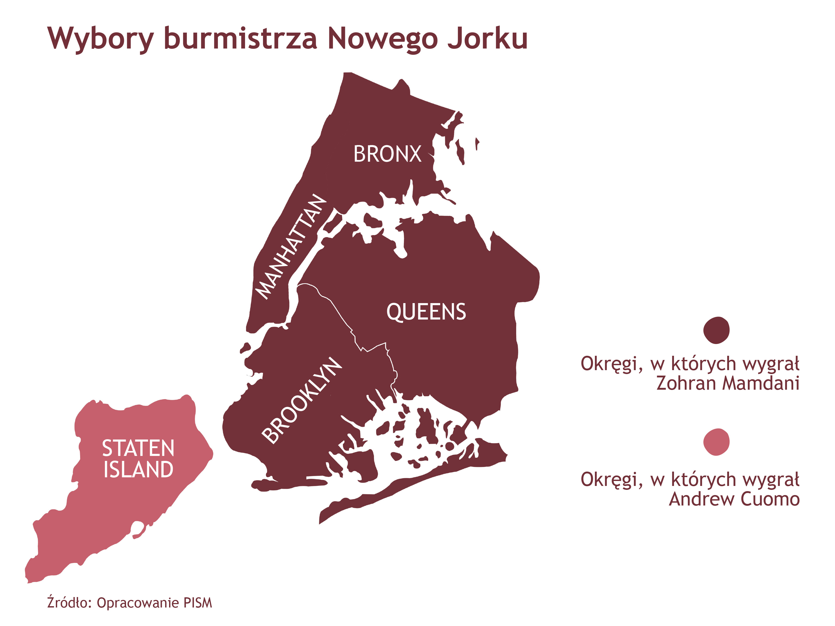 Wygrana Mamdaniego, związanego z ugrupowaniem Demokratycznych Socjalistów Ameryki, odzwierciedla rosnącą zdolność partii do konsolidacji różnorodnych grup wyborców. Kampania tego kandydata, reprezentującego młodsze pokolenie Amerykanów (ma 34 lata, a karierę polityczną rozpoczął w 2021 r.), opierała się na akcentowaniu rosnących kosztów życia, dostępności usług publicznych i kwestii socjalnych, co pozwoliło mu zbudować szeroką koalicję obejmującą młodych wyborców, migrantów oraz części miejskiej klasy średniej. Wskazuje to, że ekonomiczny populizm w wydaniu progresywnym może być efektywnym narzędziem mobilizacji elektoratu w dużych ośrodkach miejskich. Równoczesne zwycięstwa umiarkowanych kandydatek Demokratów w wyborach na urząd gubernatora w Virginii – odbitej Republikanom po czterech latach rządów – i New Jersey świadczą o odbudowywaniu przez partię zdolności do rywalizacji w bardziej zróżnicowanych okręgach po porażkach poniesionych w wyborach w 2024 r. Z kolei decyzja kalifornijskich wyborców o zmianie zasad podziału okręgów wyborczych, faworyzująca Demokratów, wzmacnia ich strukturalną pozycję przed wyborami połówkowymi do Kongresu w listopadzie 2026 r. i zwiększa szanse na zdobycie większości mandatów do Izby Reprezentantów.