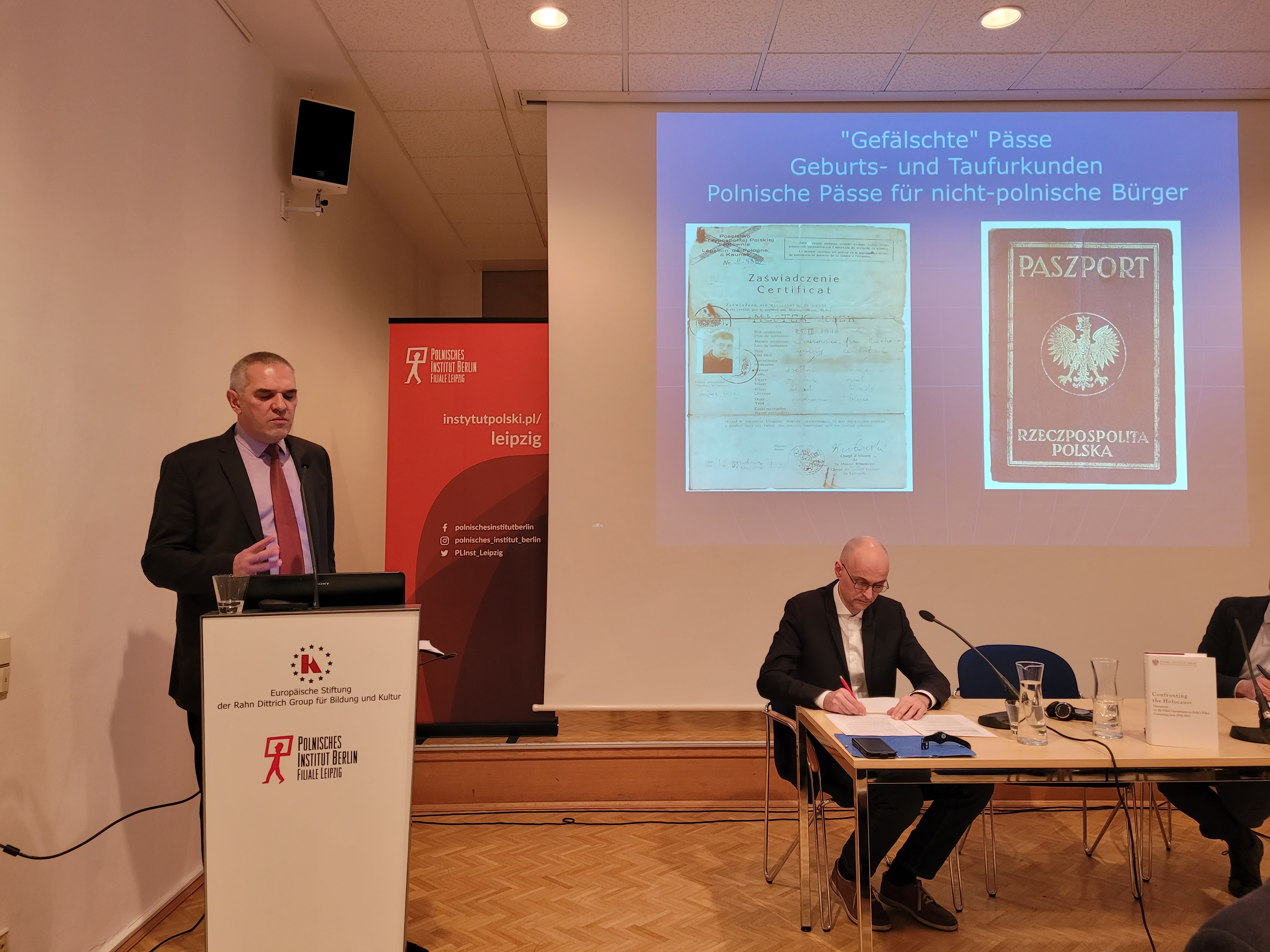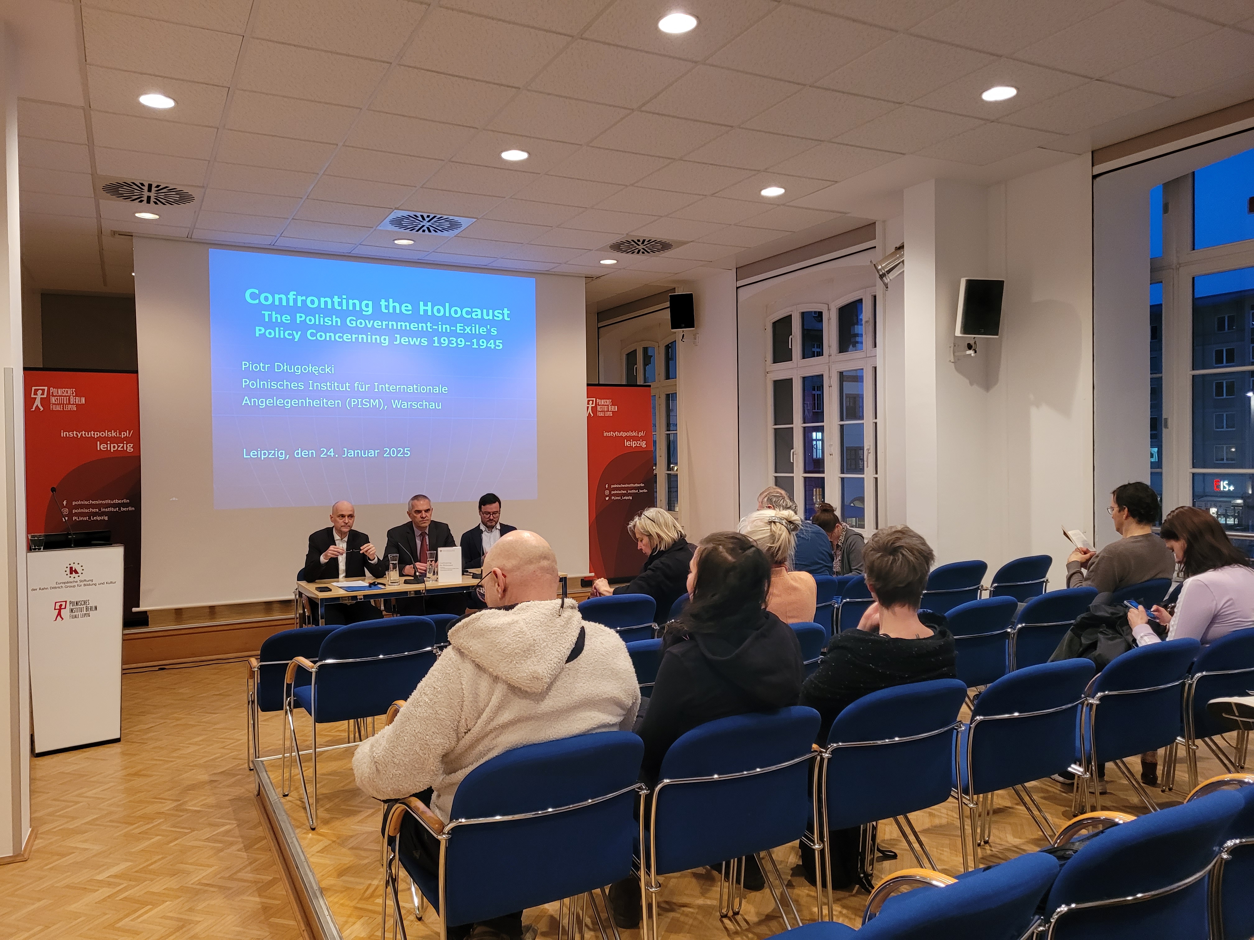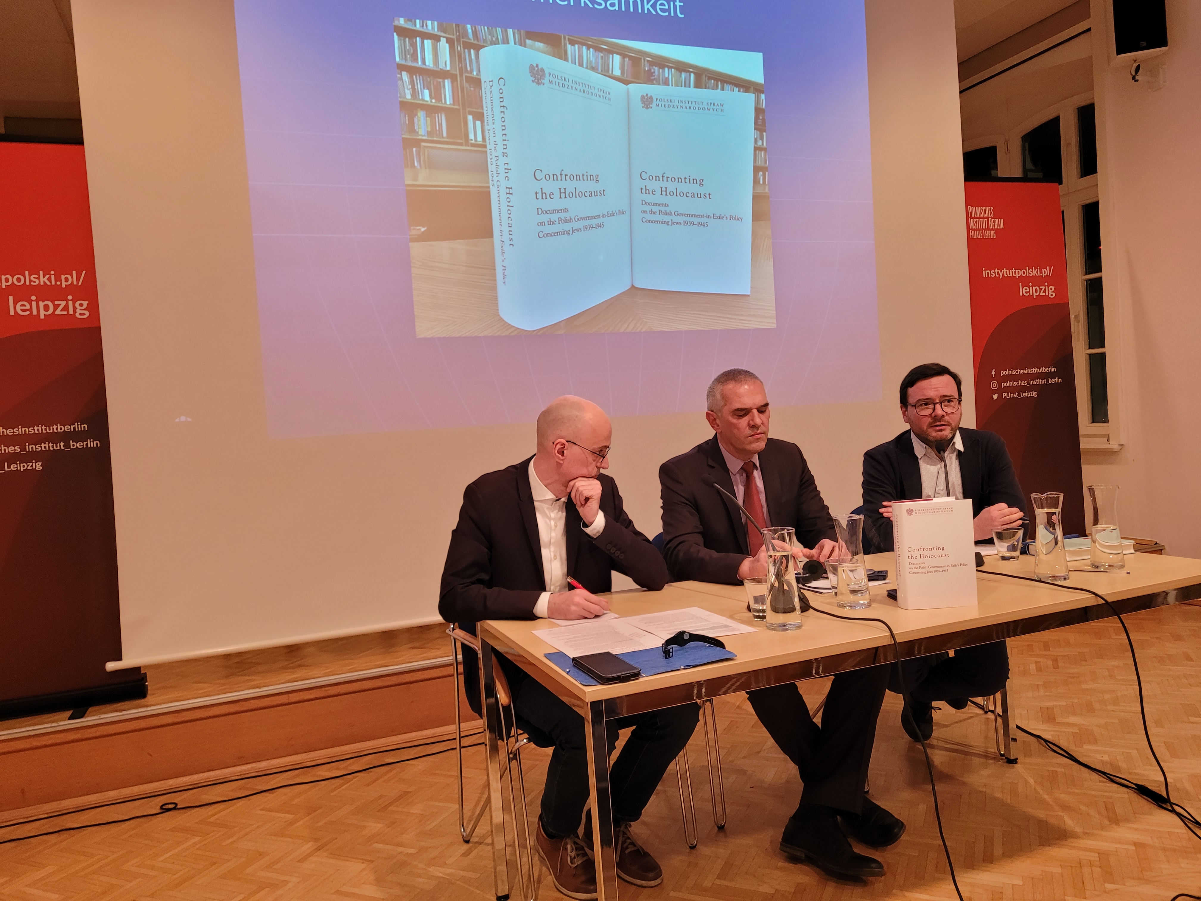24 stycznia 2025 r. w Instytucie Polskim w Lipsku odbyła się dyskusja poświęcona tomowi „Confronting the Holocaust. Documents on the Polish Government-in-Exile’s Policy Concerning Jews 1939-1945”. W debacie udział wzięli redaktor naukowy tomu i redaktor naczelny serii PDD Piotr Długołęcki oraz dr Stephana Stacha (historyk z Lipska). Rolę moderatora pełnił prof. Tytus Jaskułowski z Uniwersytetu Zielonogórskiego, zaś uroczystego otwarcia dyskusji dokonał Bernd Karwen z Instytutu Polskiego w Lipsku.