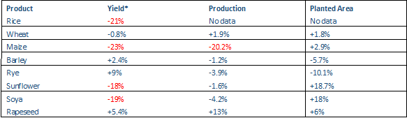 In the summer, a large part of the EU was affected by drought, which reduced yields and harvests. On 22 August, the Joint Research Centre (part of the European Commission) reported that 47% of Europe’s territory was in a warning condition (the second of the three-level system depicting agricultural drought—soil moisture in deficit) and 17% in alert conditions (the highest level, indicating vegetation shows signs of stress). Rice, maize, olives, sunflower, and soya were particularly affected (see Table 1). The EU production of sunflower and soya decreased despite considerable growth of the planted area (almost by a fifth).