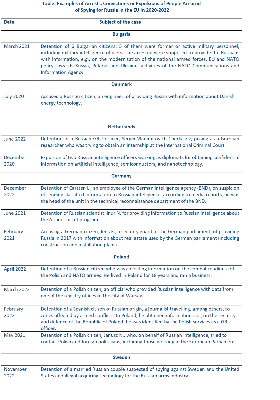 The cases of Russian espionage detected so far in the EU confirm that Russia manages to place spies in strategically important institutions of the Member States (see table below). Despite the reduction in the number of intelligence officers working under diplomatic cover in 2022, Russia still has great potential to conduct espionage activities due to, among others, the different Member State policies. Given the long-term nature of Russia’s aggression against Ukraine and the resulting international sanctions, its activity will only intensify. To counteract this, it is necessary to strengthen counterintelligence capabilities in the EU. In order to raise public awareness of the scale of espionage by third countries, including Russia, in the EU, the European External Action Service could consolidate information on such incidents and ongoing investigations, identify foreign intelligence interests and losses suffered by the EU, and make this information available on a regular basis in the form of reports. In cases where further Russian diplomats are identified as spies, Poland could also encourage EU countries to coordinate further expulsion of Russian diplomatic corps from EU territory.