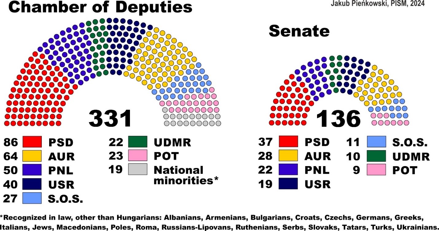 It is likely that the new majority will be a grand coalition of all of the moderate parties—PSD, PNL, USR, and UDMR. The Social Democrats initially distanced themselves from Lasconi’s call for such a government, as the USR had been unequivocally critical of its would-be partner. PSD announced an attempt to form a cabinet with the PNL and UDMR, which was part of the coalition until 2023, but without USR, the coalition would have a minimal majority in the Senate while in the Chamber of Deputies it would depend on support from at least 19 deputies from other national minorities groupings (although they generally support any government). The Social Democrats are probably dragging out the decision on their readiness to join the grand coalition in a bid to force their partners to agree to appoint as prime minister again Marcel Ciolacu, whom the PSD leaders persuaded to withdraw his resignation from the party leadership after losing in the first round of the presidential election (despite expectations). The participation of nationalist parties in a governing coalition or their formation of a minority government is unlikely, as all moderate groupings rule out cooperation with them.