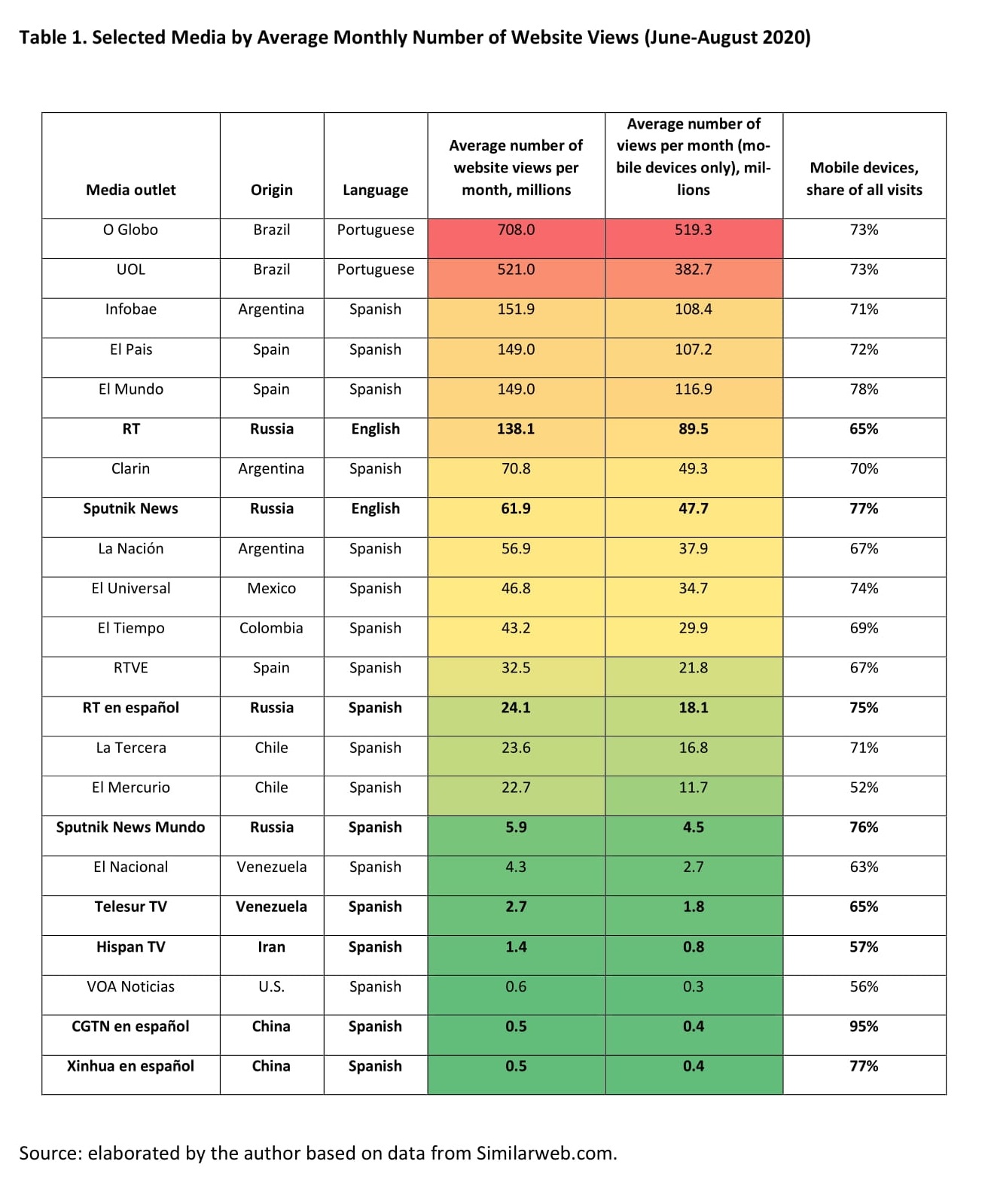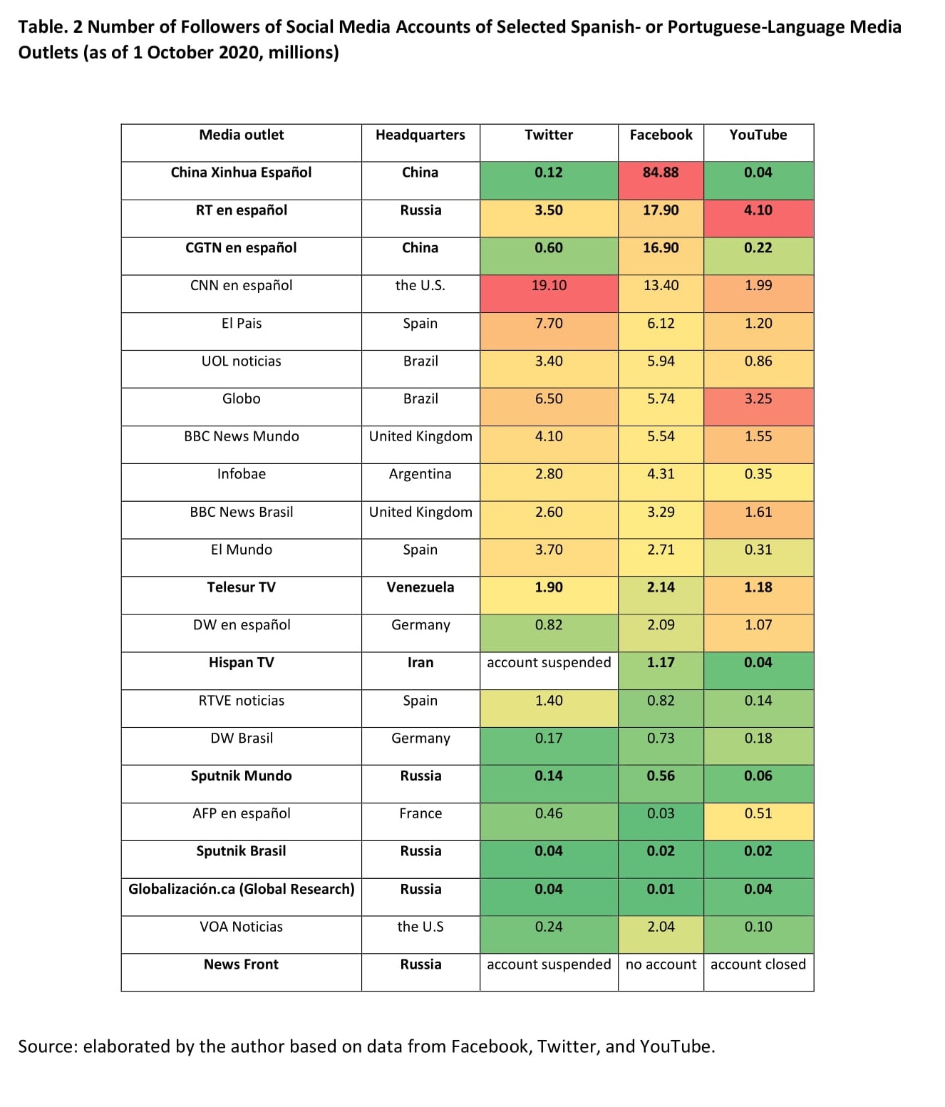 The increasing media involvement of Russia, China, and Iran in Latin America took place over the last decade (see Table 2). Among the Russian entities, the most popular are the Spanish-language branch of RT television, which launched in 2009, and the news portal Sputnik, active since 2014 with Spanish and Portuguese versions. China operates its CGTN TV and Xinhua news agency in Spanish, but it focuses on building partnerships with other media and expanding the group of journalists friendly to China in the region. Iran uses Hispan TV, established in 2011, to break international isolation and spread content defaming the U.S. and Israel, amongst others.