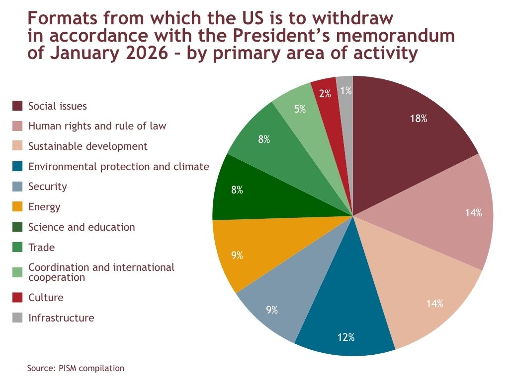 The US administration is also withdrawing from a number of multilateral bodies, in addition to those it had already announced it would leave by 2025, such as the WHO and UNESCO. In January, President Trump announced the US’s withdrawal from 66 organisations, including 31 UN-affiliated bodies, and signalled further similar steps. Key formats being abandoned include institutions dealing with energy and climate issues: the United Nations Framework Convention on Climate Change, the Intergovernmental Panel on Climate Change (IPCC) and the International Renewable Energy Agency (IRENA). Signalling reluctance towards the UN peacekeeping model, international law, and the promotion of the rule of law is, in turn, the withdrawal from, amongst others, the work of the Peacebuilding Commission and Fund, as well as the International Law Commission (ILC) and the Venice Commission. Furthermore, the US is set to leave mainly institutions dealing with sustainable development (such as the United Nations Conference on Trade and Development, UNCTAD), environmental protection (the International Union for Conservation of Nature, IUCN) and social issues (e.g. UN Women, the United Nations Population Fund). Outside those mentioned, the vast majority of these bodies play a negligible role in their respective fields, and from the perspective of budgetary savings, withdrawal from them is understandable.