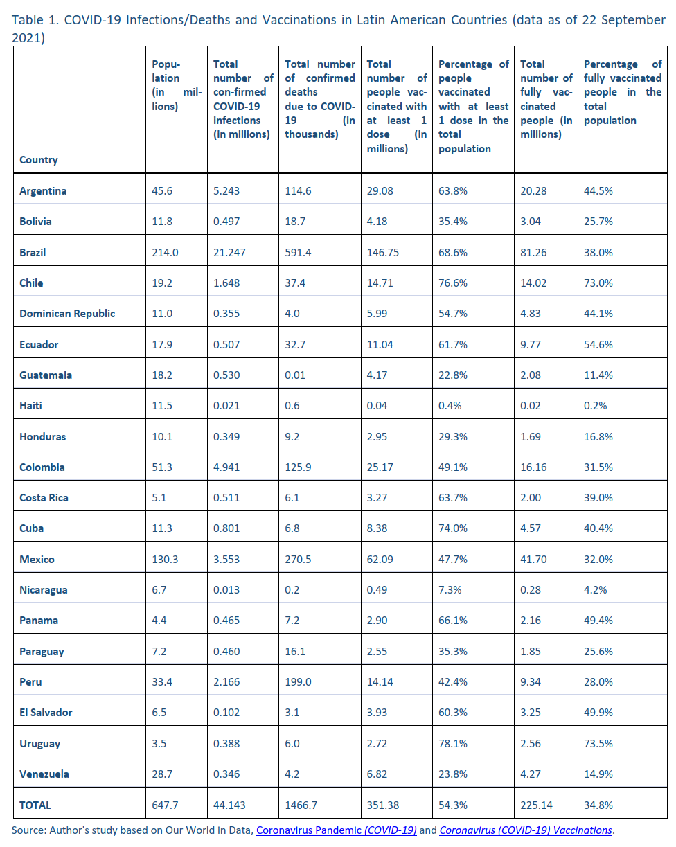 Latin America’s 20 countries comprise nearly 650 million inhabitants, or more than 8% of the world's population. To date, the region has registered almost 44 million infections and 1.46 million deaths linked to COVID-19—almost 20% and 32% of cases worldwide, respectively. The enduring restrictions in most of the region have not helped to prevent further waves of infection. These attempts have been challenged by societal specificities, for example, a large informal labour market, inefficient healthcare, and new variants of the SARS-CoV-2 virus. Vaccination campaigns are key to tackling the pandemic in the region, but certain difficulties hinder them.