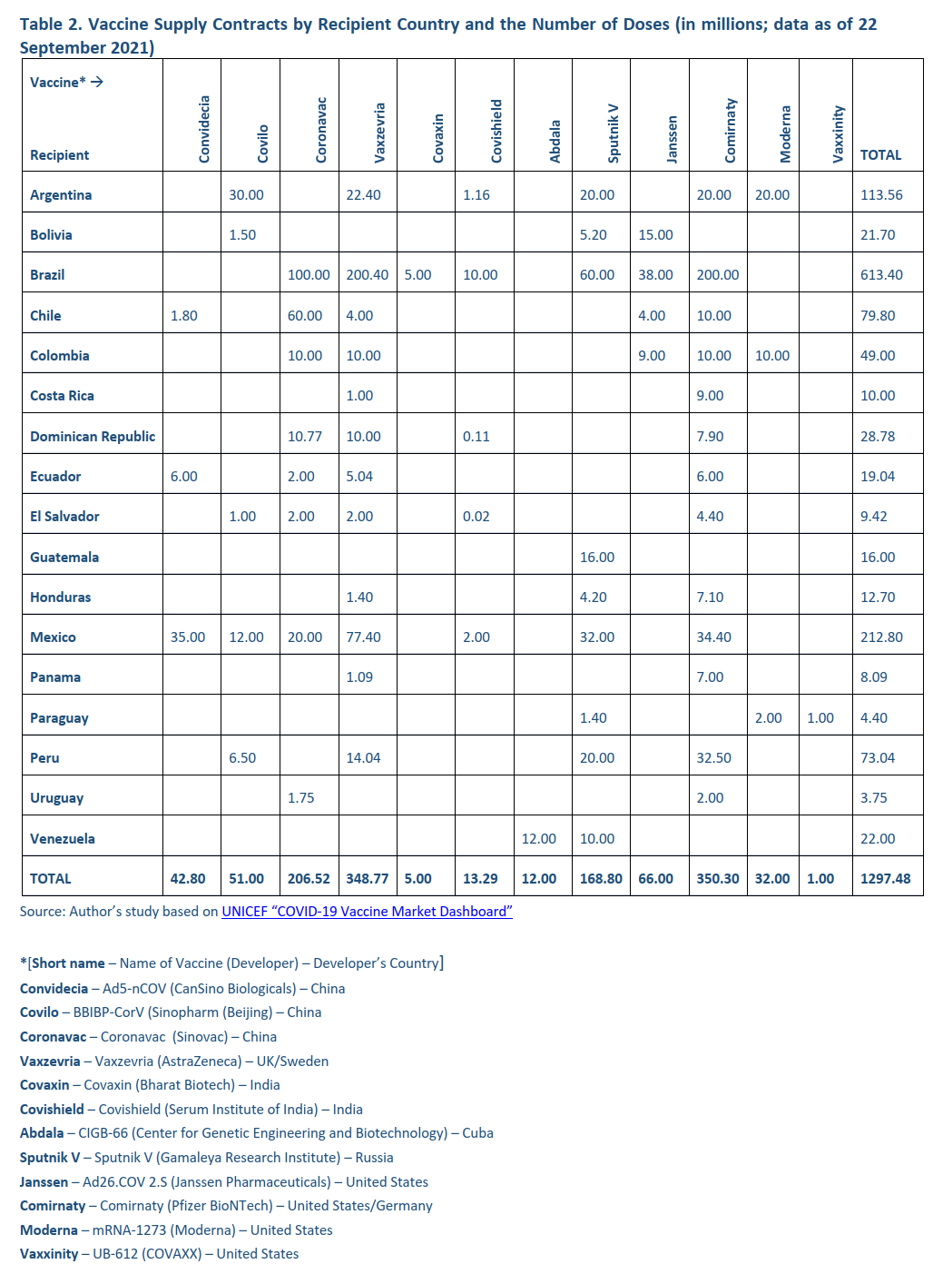 Comirnaty and Vaxzevria comprise the highest portions of the doses supplied or ordered. CoronaVac and Sputnik V are next, and China and Russia have been most active in vaccine diplomacy in Latin America where they use their respective vaccines to improve their international image and increase their political influence. The speed of the vaccines’ development, competitive contract terms, and intensive promotion of the vaccines and aid activities support these countries’ efforts.