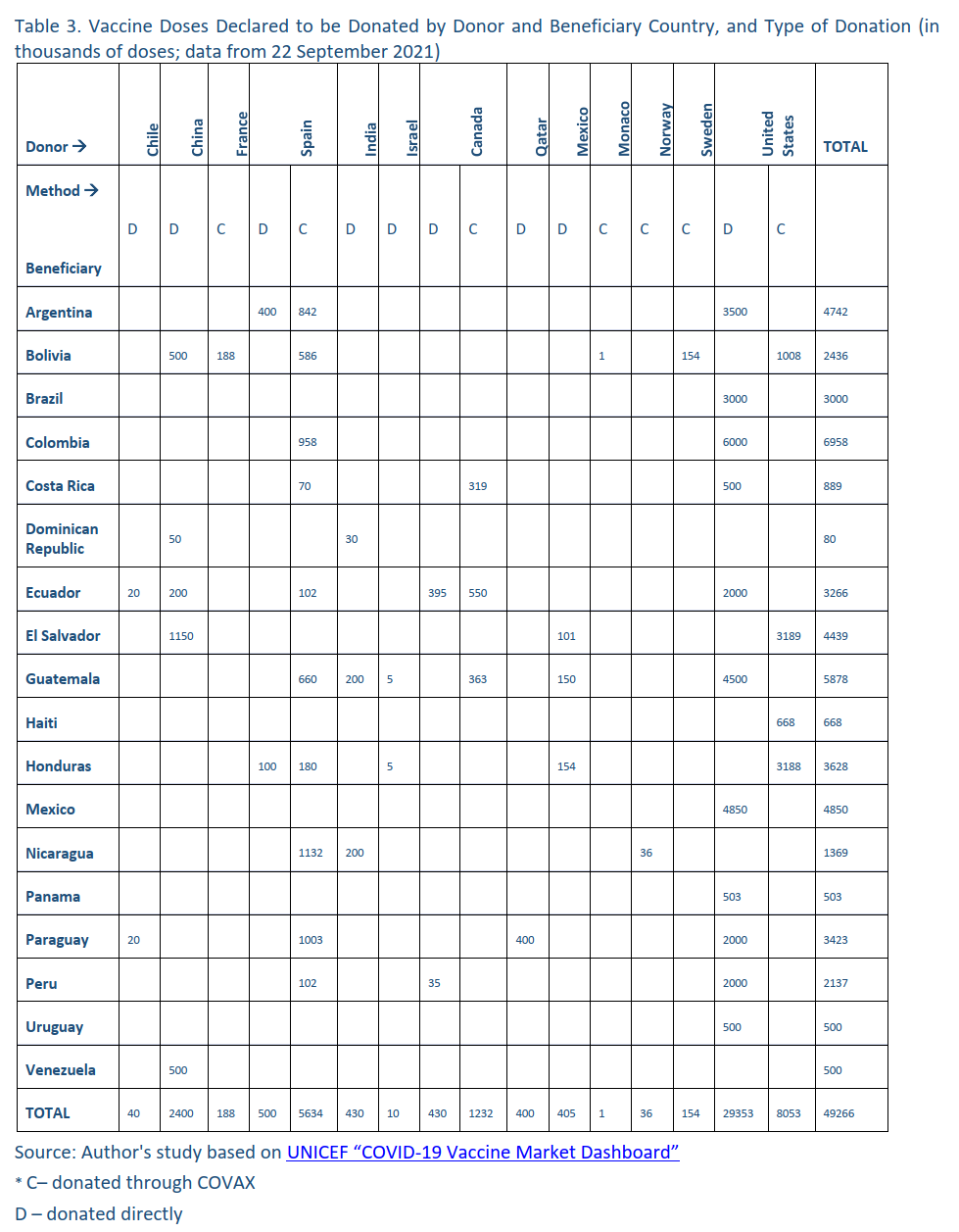 In obtaining vaccines, most countries in the region have relied on individual purchases (see Table 2) and supplies from COVAX, the global mechanism for broader access to COVID-19 vaccines (Bolivia, Haiti, Honduras, Nicaragua, and El Salvador are eligible for free doses). In recent months, foreign donations have become an important source (see Table 3). Several countries have signed manufacturing agreements. Vaxzevria, the official name of AstraZeneca vaccine, and CoronaVac, by Sinovac, a Chinese company, are both produced in Brazil. Pfizer’s vaccine (Comirnaty) will be made there from 2022. There are attempts to produce a Brazilian vaccine as well. Chile produces CoronaVac, and Argentina and Mexico manufacture Vaxzevria and the Russian Sputnik V (which Peru also plans to make starting next year).