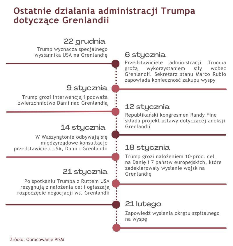 21 lutego Donald Trump zapowiedział w mediach społecznościowych, że we współpracy z Jeffem Landrym – gubernatorem Luizjany i zarazem specjalnym wysłannikiem prezydenta ds. Grenlandii –wyśle na wyspę okręt szpitalny. Deklarowanym celem operacji jest „zajęcie się wieloma chorymi ludźmi, którzy nie są tam objęci opieką”. Kontekst dla niej stanowi fakt, że tego samego dnia Duńczycy pomogli w ewakuacji amerykańskiego marynarza z pokładu okrętu podwodnego działającego w pobliżu Grenlandii i przetransportowali go do szpitala w Nuuk. Zapowiedź Trumpa ma podważać zdolność zarówno władz lokalnych, jak i Danii do sprawowania kontroli nad wyspą, w tym objęcia opieką lokalnej społeczności. Spotkała się z publiczną odmową premiera Grenlandii Jensa-Frederika Nielsena. Niejasne są faktyczne cele takiej operacji ze strony USA. Może być ona trudna do szybkiego przeprowadzenia, ponieważ obie amerykańskie jednostki szpitalne znajdują się w stoczni remontowej w Alabamie – USNS Mercy od sierpnia 2025 r. i USNS Comfort od stycznia br. – oraz pozostaną tam najprawdopodobniej przez kolejnych kilka miesięcy. Deklaracja wysłania okrętu wskazuje jednak, że ambicje prezydenta USA w zakresie uzyskania kontroli nad wyspą się nie zmieniły, pomimo potencjalnych innych obszarów zaangażowania politycznego i militarnego, głównie w Iranie. Dowodzi to również, że ramy negocjacyjne ustanowione między USA i sojusznikami z NATO w związku z eskalacją sytuacji wokół wyspy w styczniu br. doprowadziły tylko do załagodzenia sytuacji, ale nie zmieniły celów administracji Trumpa.