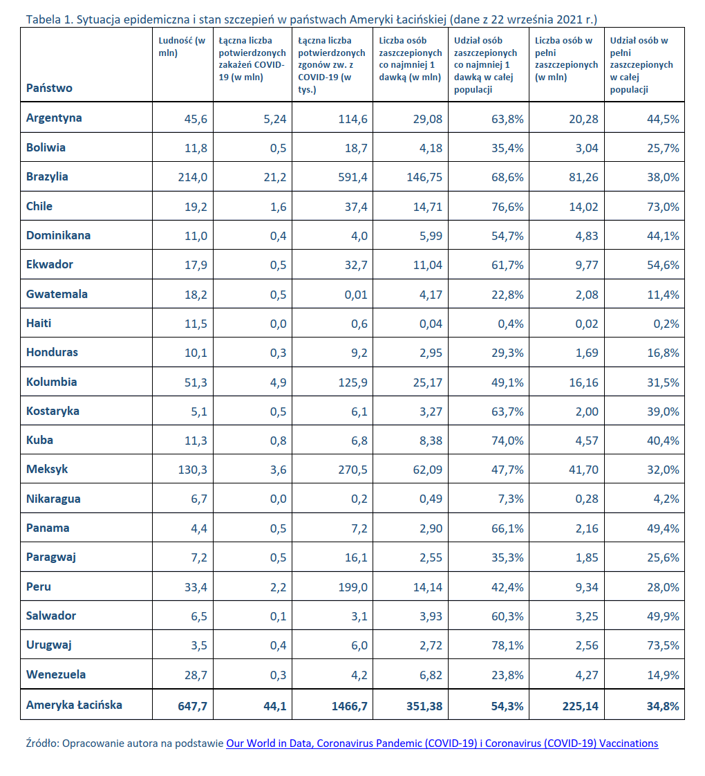 Dwadzieścia państw Ameryki Łacińskiej zamieszkuje blisko 650 mln osób (ponad 8% światowej populacji). Do tej pory zarejestrowano tam łącznie prawie 44 mln zakażeń i 1,46 mln zgonów związanych z COVID-19 – odpowiednio prawie 20% i 32% przypadków na świecie. Długotrwałe restrykcje wprowadzone w większości państw regionu nie zapobiegły kolejnym falom zakażeń. Wyzwaniami okazały się m.in. specyfika życia społecznego (np. duży udział szarej strefy na rynku pracy), niewydolny system ochrony zdrowia oraz nowe warianty koronawirusa. Kluczowa dla opanowania pandemii jest akcja szczepień, która napotkała w regionie różne trudności.
