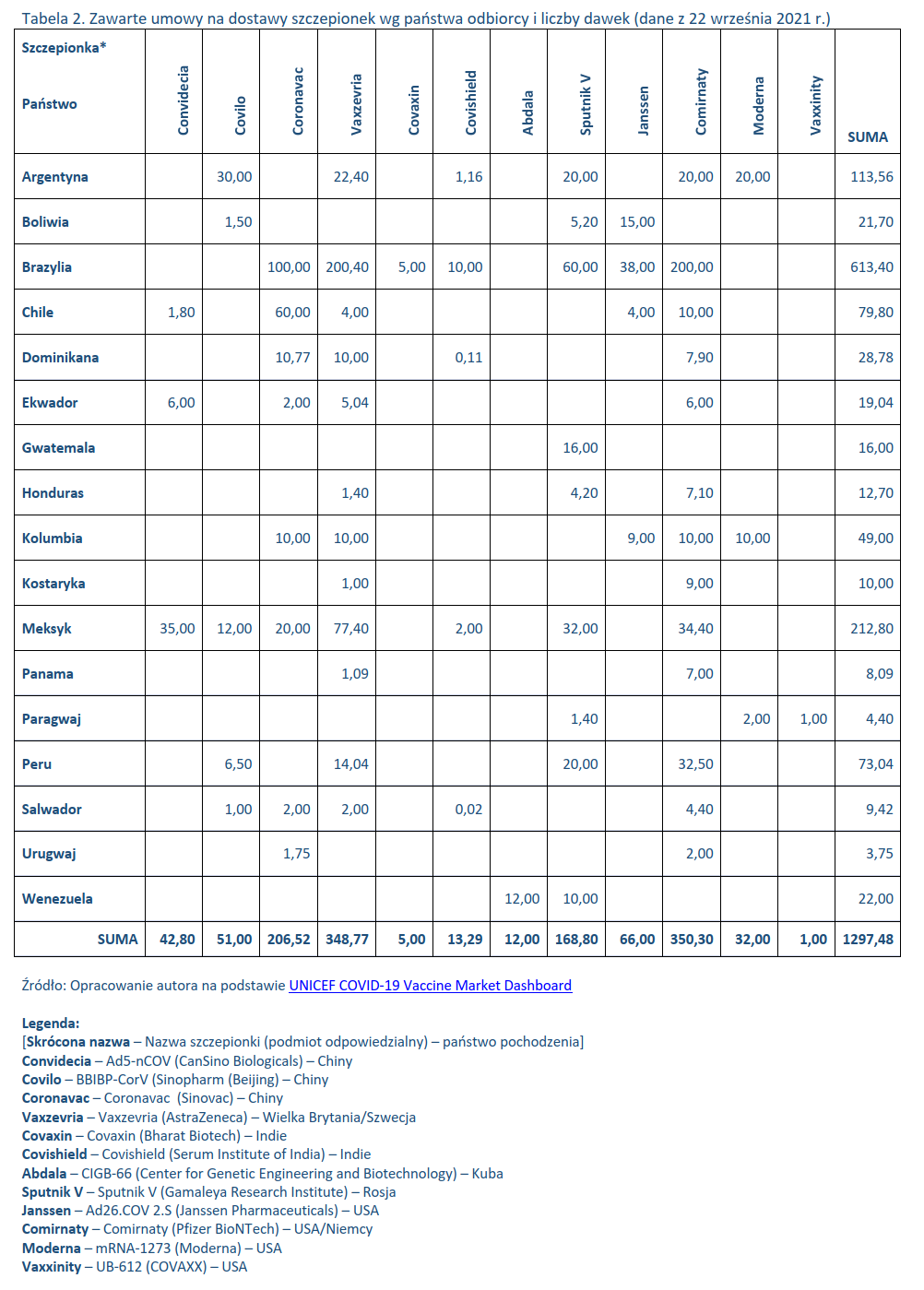 W pozyskaniu szczepionek większość państw regionu polegała na zakupach indywidualnych (zob. tabela 2) oraz dostawach poprzez COVAX (globalny mechanizm na rzecz dostępności preparatów) – Boliwia, Haiti, Honduras, Nikaragua i Salwador kwalifikują się do otrzymywania bezpłatnych dawek. W ostatnich miesiącach ważnym źródłem stały się też zagraniczne dary (zob. tabela 3). Kilka państw podpisało umowy w sprawie wytwarzania szczepionek. W Brazylii produkowane są Vaxzevria (oficjalna nazwa szczepionki firmy AstraZeneca) i CoronaVac (chińskiej firmy Sinovac), a od 2022 r. będzie wytwarzany także Comirnaty (Pfizer/BioNTech). Trwają również prace nad brazylijskim preparatem. W Chile produkowana jest szczepionka CoronaVac, a w Argentynie i Meksyku – Vaxzevria oraz rosyjski Sputnik V (ma go też produkować Peru).