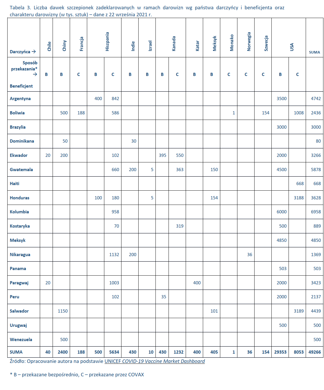 USA od początku pandemii udzielały wsparcia państwom Ameryki Łacińskiej w ramach pomocy rozwojowej, ale z dużym opóźnieniem włączyły się w przekazywanie szczepionek. Administracja Joe Bidena dopiero w marcu br. zadeklarowała 4 mld dol. na rzecz COVAX i pomoc Meksykowi. W kolejnych miesiącach zapowiedziała przekazanie 80 mln dawek różnym partnerom – 60 mln za pośrednictwem COVAX (z tego 1/3 dla Ameryki Łacińskiej i Karaibów), a pozostałe 20 mln – bezpośrednio, m.in. dla państw tego regionu. W czerwcu br. zadeklarowała 500 mln dawek w ramach COVAX dla 92 najbiedniejszych państw do czerwca 2022 r. Obecnie USA mają największy udział w darowiznach szczepionek dla Ameryki Łacińskiej.