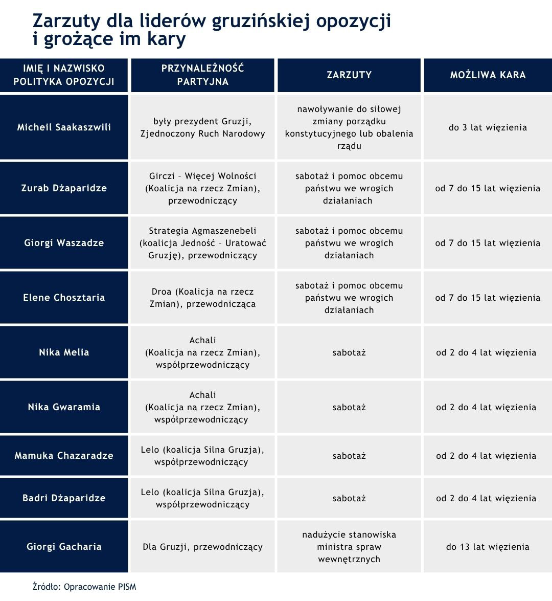 Liderzy partii prozachodniej opozycji w Gruzji zostali oskarżeni m.in. o sabotaż, nawoływanie do obalenia rządu i naruszenie porządku konstytucyjnego. Grożą im kary wieloletniego pozbawienia wolności.
