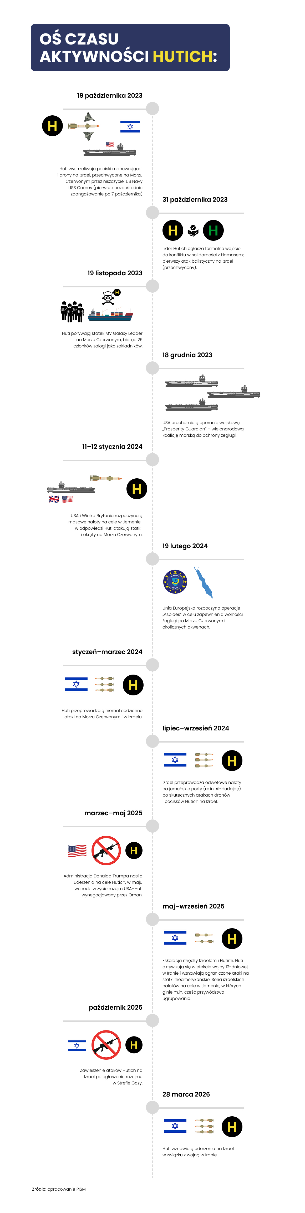 27 marca br. jemeńscy Huti wystosowali oświadczenie, w którym swój udział w wojnie w Zatoce Perskiej uzależniają od włączenia się do niej też kolejnych państw, użycia przez USA Morza Czerwonego do operacji antyirańskich i dalszej eskalacji względem Iranu i Osi Oporu. Natomiast dzień później rozpoczęli oni pojedyncze ataki balistyczne i dronowe na Izrael o ograniczonej efektywności. Włączenie się Hutich do wojny dopiero po miesiącu od jej rozpoczęcia wynika z obecnego stanu konfliktu – wysokiego ryzyka amerykańskiej operacji lądowej w Iranie, przy jednoczesnych rosnących kosztach polityczno-gospodarczych dla USA i ich sojuszników. Groźba zablokowania kolejnej po Ormuzie cieśniny kluczowej dla globalnej gospodarki (na Bab al-Mandab przypada 12% handlu światowego) i ryzyko nowych ataków na regionalną infrastrukturę energetyczną (przede wszystkim saudyjską) mają powstrzymać państwa arabskie od aktywnego włączenia się w działania przeciwko Iranowi, utrudnić przerzut sił amerykańskich przez Morze Czerwone i wymóc na USA szybsze zakończenie wojny. Huti mogą wciąż kalibrować swoje zaangażowanie, wstrzymując się od operacji morskich i koncentrując swoje ataki tylko przeciwko Izraelowi, wiążąc je przede wszystkim z jego operacją w Libanie przeciwko Hezbollahowi.