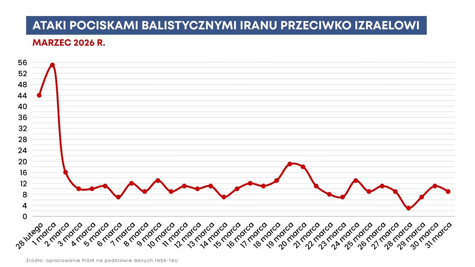 Jednym z priorytetowych celów nalotów USA i Izraela na Iran była likwidacja jego arsenału pocisków balistycznych, ich rezerw i linii produkcyjnych. Mimo znacznego uszczuplenia irańskich zasobów nie udało się wyeliminować zagrożenia dla Izraela. Przedwojenne szacunki wywiadu Izraela o 2,5 tys. pocisków średniego zasięgu Iranu mogły być zaniżone i nie uwzględniać rosnącej produkcji Iranu po wojnie 12-dniowej (czerwiec 2025 r.) ani pomocy materialnej udzielonej w tym okresie przez Chiny. W pierwszych dniach wojny Izrael był atakowany większymi salwami pocisków, następnie ich skala szybko zmalała (zob. wykres). Wynikało to ze strat i zmiany taktyki Iranu oraz skutecznej obrony i ofensywnych działań Izraela. Równolegle uderzenia USA skupiły się na wyrzutniach pocisków krótkiego zasięgu, tworzących zagrożenie dla ich baz i sojuszników w Zatoce Perskiej. W połowie marca widać było, że Iran używa więcej pocisków z głowicami kasetowymi przeciwko głównym miastom Izraela lub precyzyjniejszych głowic przeciw takim celom jak lotnisko Ben Guriona i sąsiedztwo ośrodka nuklearnego w Dimonie. Zmieniały się przy tym też oceny szkód w arsenale Iranu. W połowie marca wywiad USA i Izraela zgodnie zakładały, że zniszczono aż 70% wyrzutni pocisków i 75% fabryk pocisków. Z kolei z początkiem kwietnia zaktualizowana ocena USA stwierdziła, że wyeliminowano najprawdopodobniej jedynie 50% irańskich wyrzutni. Według niektórych ekspertów pozarządowych straty te mogą być jeszcze niższe i sięgać tylko 30% arsenału Iranu. Niepokój mediów w Izraelu budziły przy tym wyczerpane zapasy przeciwpocisków Arrow i konieczność szybkiego zwiększenia ich produkcji. Dopóki to nie nastąpi, USA będą zapewne utrzymywać w Izraelu i Jordanii baterie systemów przeciwrakietowych THAAD i PAC, co na dłużej ograniczy ich zdolności w tym zakresie w Europie i Azji.