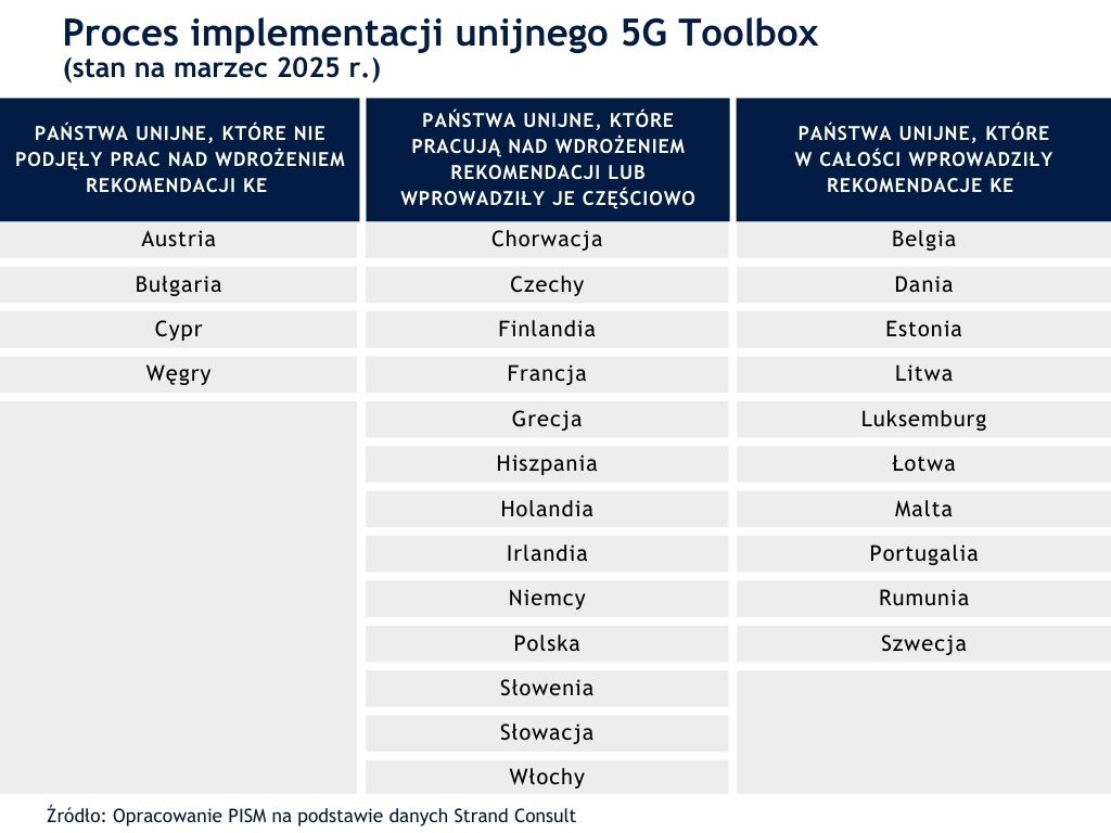 W kwietniu 2025 r. Komisja Europejska rozpoczęła konsultacje zmian w obowiązującym od 2019 r. Akcie cyberbezpieczeństwa UE. Wówczas stał się on podstawą wydania przez KE rekomendacji w kontekście budowy infrastruktury 5G (5G Toolbox) dotyczących wprowadzania przez państwa członkowskie mechanizmów anulowania bądź ograniczania współpracy z firmami z państw trzecich stanowiących zagrożenie dla bezpieczeństwa, przede wszystkim z ChRL (głównie Huawei i ZTE). Do marca 2025 r. takie rozwiązania wprowadziło jednak tylko osiem państw członkowskich. 20 stycznia br. KE zaproponowała nowelizację aktu, zgodnie z którą te restrykcje nie byłyby już opcjonalne, ale obowiązkowe, i dotyczyłyby bezpieczeństwa łańcuchów dostaw nowoczesnych technologii cyfrowych (ICT) nie tylko w telekomunikacji, ale również m.in. energii słonecznej czy branży skanerów lotniskowych. Zakres inicjatywy zmodyfikować może sprzeciw państw członkowskich – m.in. Hiszpania i Niemcy twierdzą, że byłoby to zbyt kosztowne dla gospodarki. Działania KE są pochodną podjętych w 2025 r. śledztw o nieuczciwą konkurencję wobec chińskich producentów z tych sektorów, jak i potrzeby szybszego zmniejszania zależności od ChRL przez państwa członkowskie. Ma to również wspomóc rozwój konkurencyjności europejskich firm z tych sektorów.