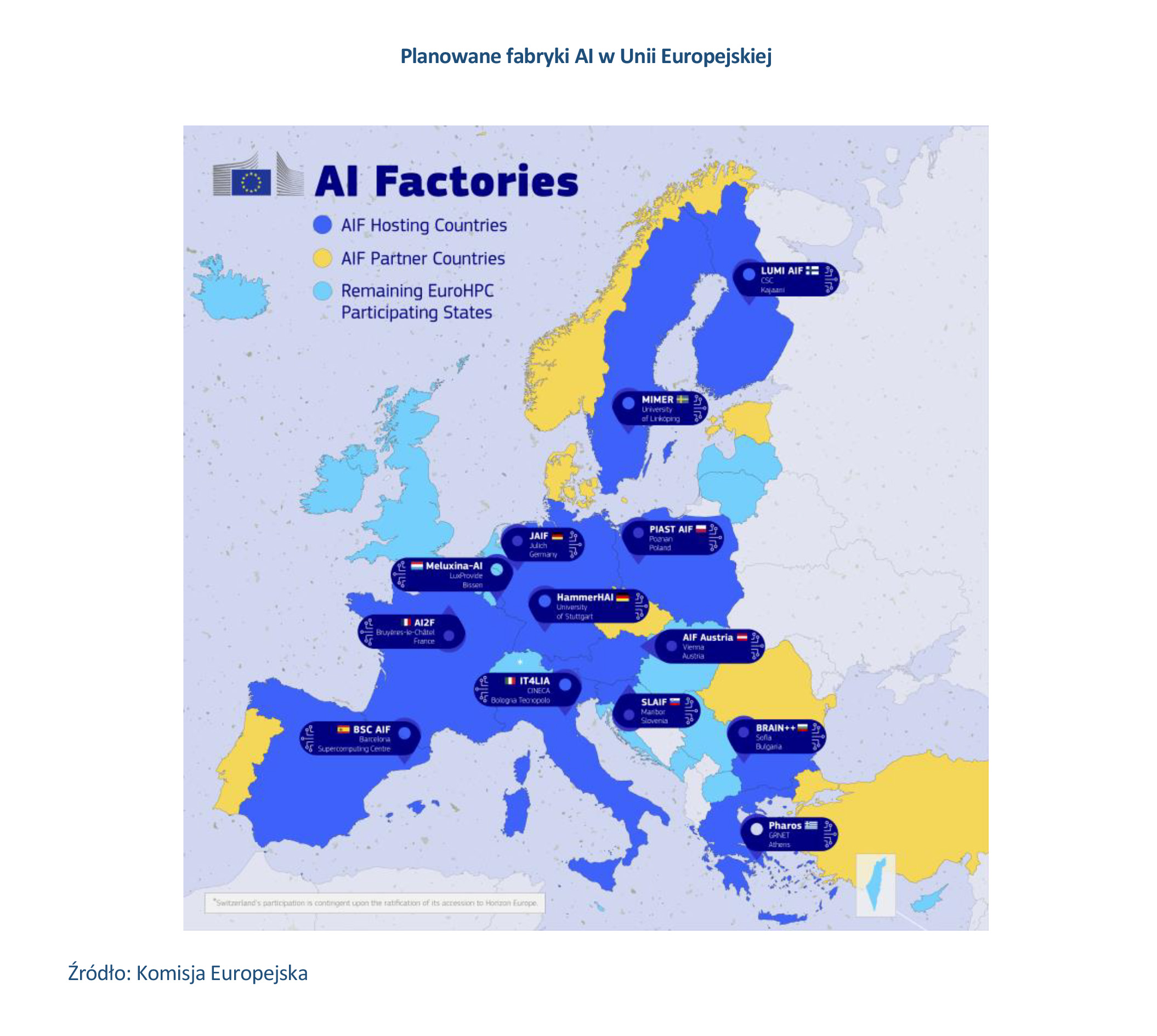 Centra danych to specjalistyczne obiekty, w których przechowywane są serwery, urządzenia sieciowe i szeroko pojęta infrastruktura informatyczna. Służą między innymi do przetwarzania, przechowywania i przesyłania dużych ilości danych. Fabryki AI to konkretny rodzaj centrów danych – wysoko wyspecjalizowana infrastruktura technologiczna, wyposażona w tysiące procesorów graficznych (GPU), zoptymalizowana pod kątem przetwarzania ogromnych zbiorów danych i intensywnych obliczeń, dzięki czemu umożliwia tworzenie, trenowanie i wdrażanie modeli sztucznej inteligencji na dużą skalę. W Planie dla kontynentu AI Komisja Europejska przewiduje wzmocnienie europejskiej sieci superkomputerów HPC (High-Performance Computing – systemy komputerowe połączone w jeden duży superkomputer do prowadzenia skomplikowanych i zaawansowanych obliczeń) właśnie poprzez budowę fabryk AI. W 12 państwach, które w 2024 r. zostały wybrane w ramach projektu EuroHPC, w tym w Polsce, powstanie 13 fabryk AI – projekt działa na zasadzie przyznawania grantów dla konsorcjów badawczych. Mają one koncentrować się na danych z kluczowych sektorów, m.in. zdrowia, środowiska czy bezpieczeństwa i technologii podwójnego zastosowania.