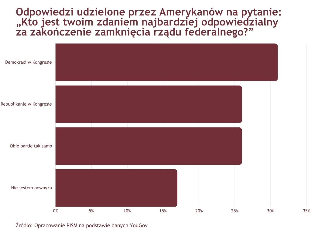 W porozumieniu zapewniono finansowanie jedynie do 30 stycznia 2026 r. Równocześnie wprowadzono trzy pełne, gotowe ustawy budżetowe dotyczące rolnictwa, budownictwa wojskowego i spraw weteranów oraz legislatury. Kluczowe dla przełamania impasu było poparcie ośmiu senatorów z Partii Demokratycznej, którzy – w obliczu narastającej presji społecznej, spowodowanej m.in. opóźnionymi i odwoływanymi lotami oraz niewypłacaniem pensji pracownikom federalnym – zdecydowali się wesprzeć tzw. czyste prowizorium budżetowe, mimo sondaży wskazujących, że większość Amerykanów obwinia Republikanów za zawieszenie działalności rządu. Demokraci ponieśli jednak istotną porażkę: z pakietu usunięto ich główny postulat, czyli przedłużenie federalnych subsydiów do ubezpieczeń zdrowotnych w ramach programu Affordable Care Act (tzw. Obamacare). Ustępstwo to wywołało ostrą krytykę części Partii Demokratycznej, która zapowiada dalszą walkę legislacyjną o subsydia. Zakończenie zawieszenia działalności rządu pozwala na przywrócenie wypłat i pracy instytucji, jednak nie rozwiązuje kluczowego sporu o finansowanie systemu ochrony zdrowia. Oznacza to, że konflikt o koszty i dostępność ubezpieczeń zdrowotnych będzie pozostawał w centrum amerykańskiej debaty politycznej.