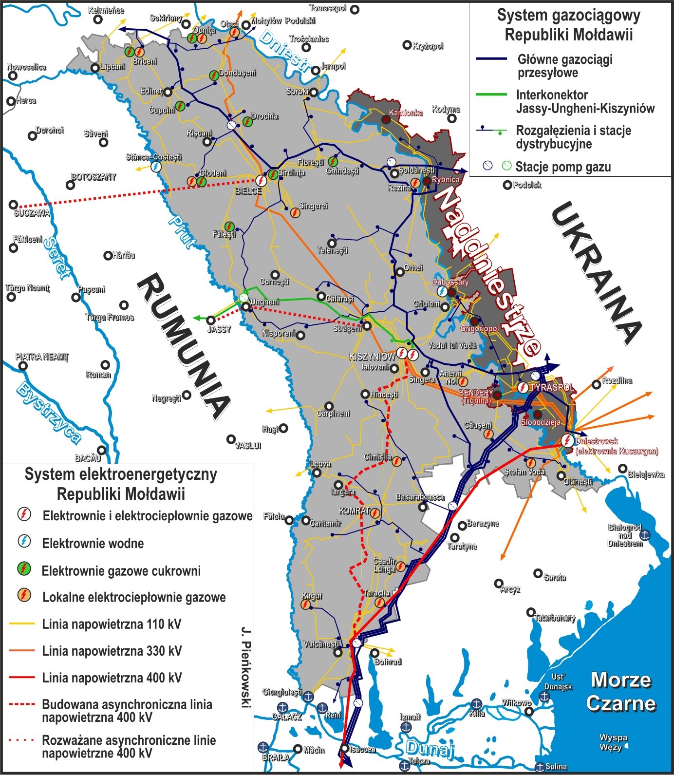 Zależność Mołdawii od rosyjskiego gazu pogłębia struktura jej elektroenergetyki – w ostatnich latach tylko do 20% potrzeb pokrywają krajowe elektrociepłownie gazowe, a ok. 3% – źródła odnawialne. Ok. 70–80% zapewnia należący do rosyjskiego koncernu Kuczurgan. Jego dumpingowe ceny sprzyjają systemowej korupcji w Mołdawii i hamują import prądu z Ukrainy, który pokrywa obecnie od kilku do kilkunastu procent potrzeb. Import z Rumunii – poza kilkoma przygranicznymi miejscowościami – uniemożliwia zsynchronizowana z ukraińskim i rosyjskim systemem sieć elektroenergetyczna.