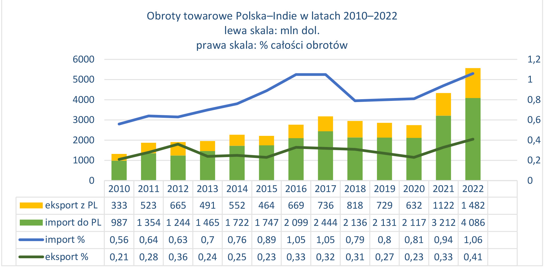 Mimo słabej współpracy politycznej lepiej rozwijały się relacje gospodarcze. W latach 2010–2022 wartość handlu towarami wzrosła niemal pięciokrotnie, z 1,32 mld dol. do 5,56 mld dol. Największy wzrost odnotowano w 2022 r., co było efektem odbicia po pandemii. Co więcej, wzrost wymiany handlowej był głównie efektem rosnącego importu z Indii. Wpływa to na zwiększający się deficyt handlowy po stronie Polski (z 650 mln dol. w 2010 r. do 2,6 mld dol. w 2022 r.).